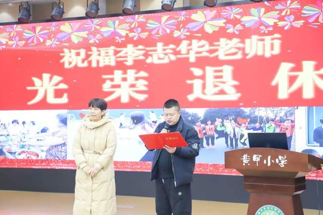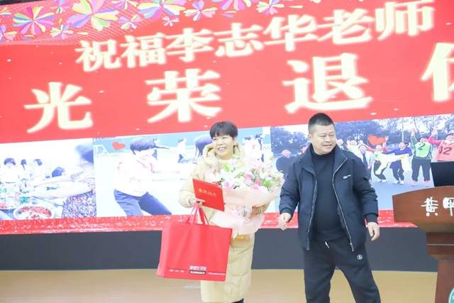 工会主席杨斌同志为即将光荣退休的李志华老师送上祝福并颁发荣誉证书。