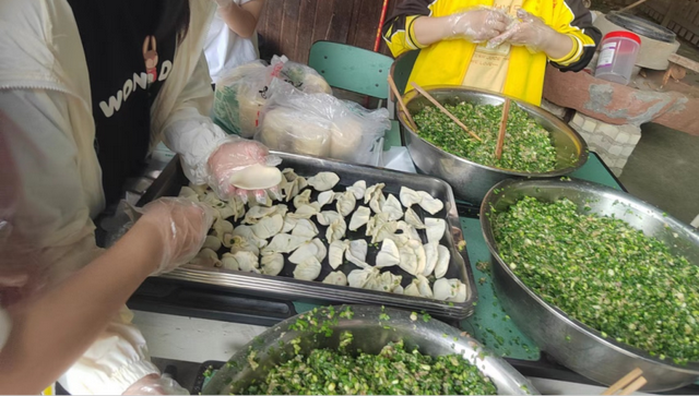 另外一边的包饺子也十分有趣呢,自己擀面皮,放馅儿……孩子们个个有模有样。