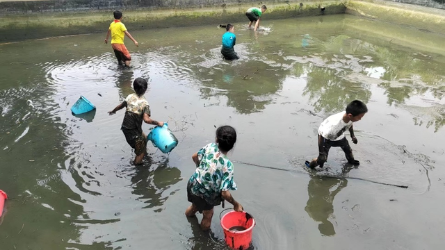 其中最吸引眼球的便是那捉鱼比赛,尽管孩子们的衣服上沾满了泥巴,但仿佛此刻全都忘记了。捉鱼不仅需要勇气,还需要智慧。聪明的孩子们弯着腰,低着头,双手做出捧东西的姿势,在水里寻找着鱼儿的踪迹,他们成功捉到了不少的鱼。孩子们捉的不仅仅是鱼,更是一份童年的快乐!