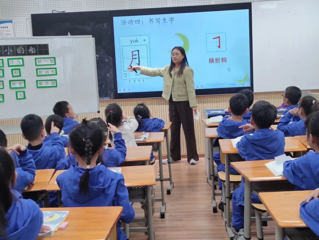 本节课利用与课文主体息息相关的“月亮姐姐进课堂”创设情境,由课题设疑,再带领学生一一闯过朗读关、字词关,解决生字难题后,回扣问题“小小的船”指什么,开始深入解疑。周老师从观察船与月的图片,带领学生结合儿歌内容探寻小船与月儿的相似之处,进而得出“小小的船”即是月儿的答案,整个解疑过程求同存异,尊重孩子是学习的主体与独立性。最后写字环节先回顾“月”字演变史,进而讲解具体书写规则,辅助学生记忆。