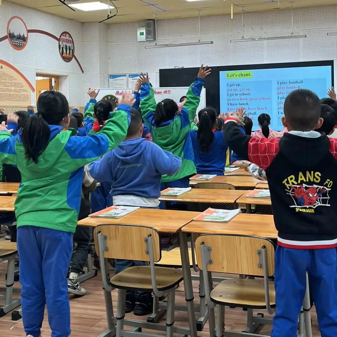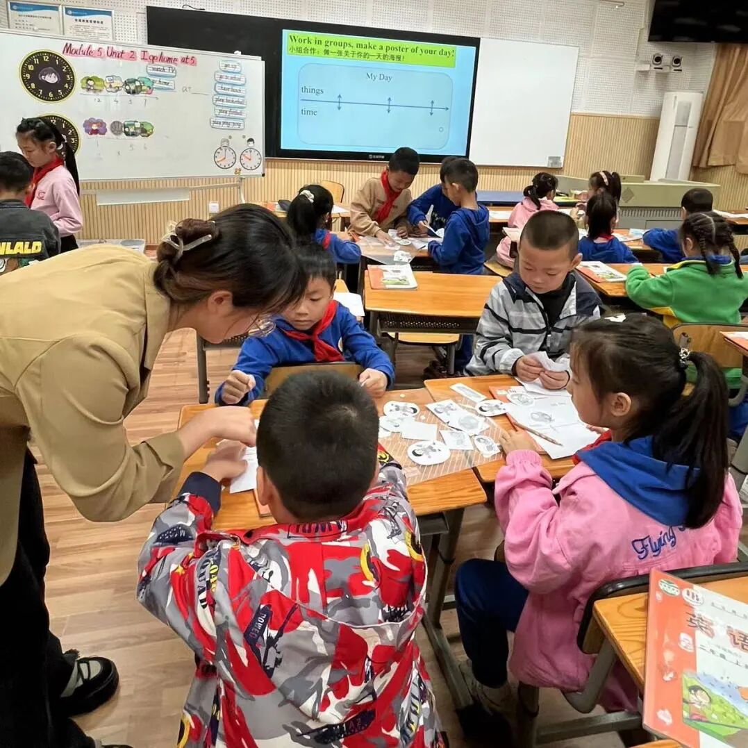 上课伊始,彭老师结合评价机制带领学生复习了数字,并为后续的时间表达做好铺垫。紧接着师生合作,利用“鹦鹉学舌”游戏完成一首关于日常活动的chant,以旧知带新知的教学方法调动学生的积极性,营造浓厚的课堂学习氛围。在课堂上彭老师以问题链为导向,以问导学,以问促思,层层递进,每个环节都有对比、发散、创造。活动关循序渐进,系统建构主题意义,让学生在一个个活动中逐步形成主动参与、乐于表达、勤于动手、善于合作的学习态度。