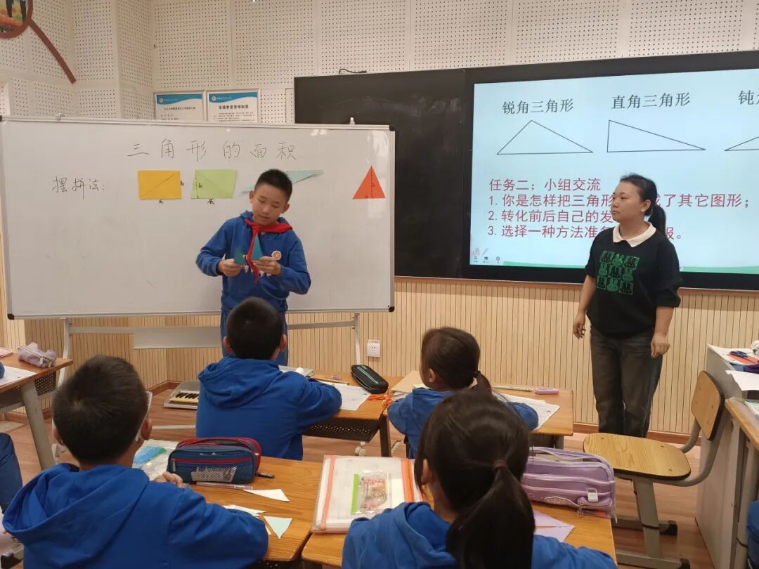 接着,郭老师发布任务,学生经历自主探索、小组合作、全班汇报环节,通过摆拼法、分割法、添补法等策略,发现方法中的共性,生生互相补充,清楚呈现了转化前后图形的变与不变,以及图形面积间的关系,总结得出三角形的面积=底×高÷2,学生随即快速地计算出了红旗的面积。