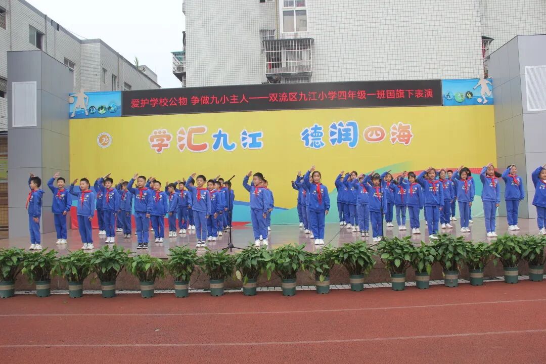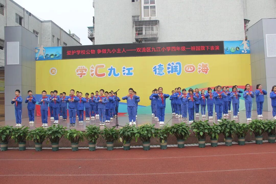 爱护公物,人人有责。为了进一步提高同学们爱护公物的意识和责任感,让同学们养成爱护公物的好习惯,10月30日,九江小学组织开展了“爱护学校公物 争做九小主人”的国旗下表演活动。