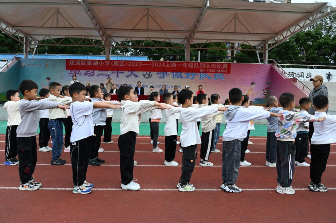 为进一步推进阳光体育蓬勃发展,培养学生的纪律意识,增强班级凝聚力和集体荣誉感,展示我校学生蓬勃向上的精神风貌,2023年10月19日下午,双流区棠湖小学(南区)举行了“一年级队列队形比赛”。本次比赛不仅是对同学们的一次检阅,也是给同学们提供一个展示风采的平台,更是对一年级师生竞争意识、团队精神、顽强拼搏的检阅。