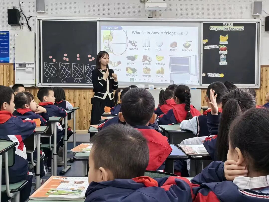 第二节课是由杨洋老师带来的二年级Module4 Unit1Do you like bananas?杨老师的课堂活泼有趣。利用精美的教具和实物来呈现重点词汇和句型,极大地吸引了低段孩子的注意力。整个教学过程通过听,猜,看,做等多种方式循序渐进,由浅入深,注重学生学习能力的培养,也让学生充分体验到了英语学习的乐趣。