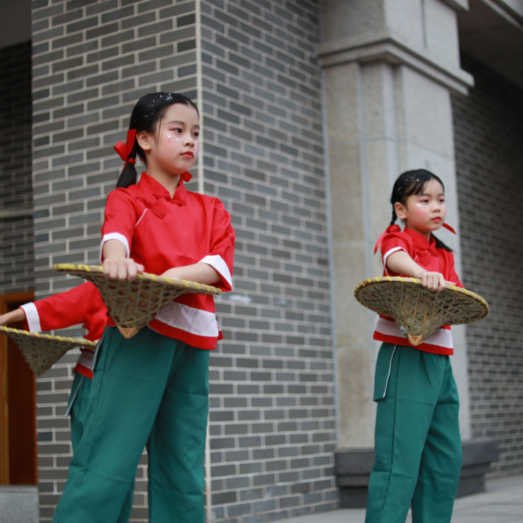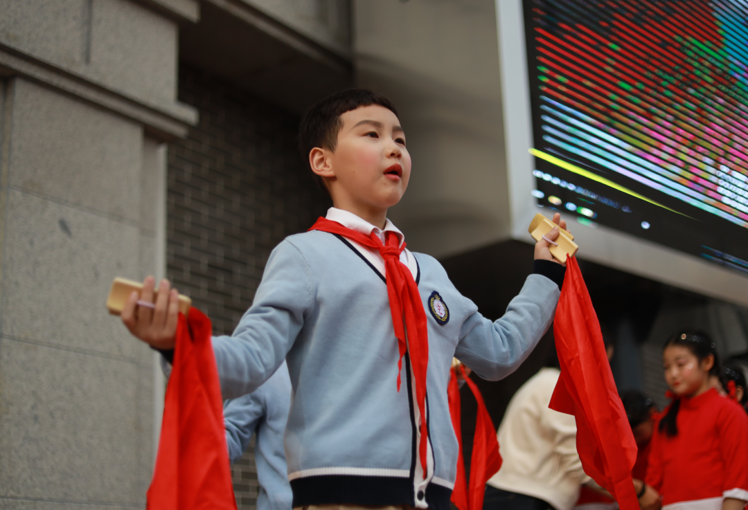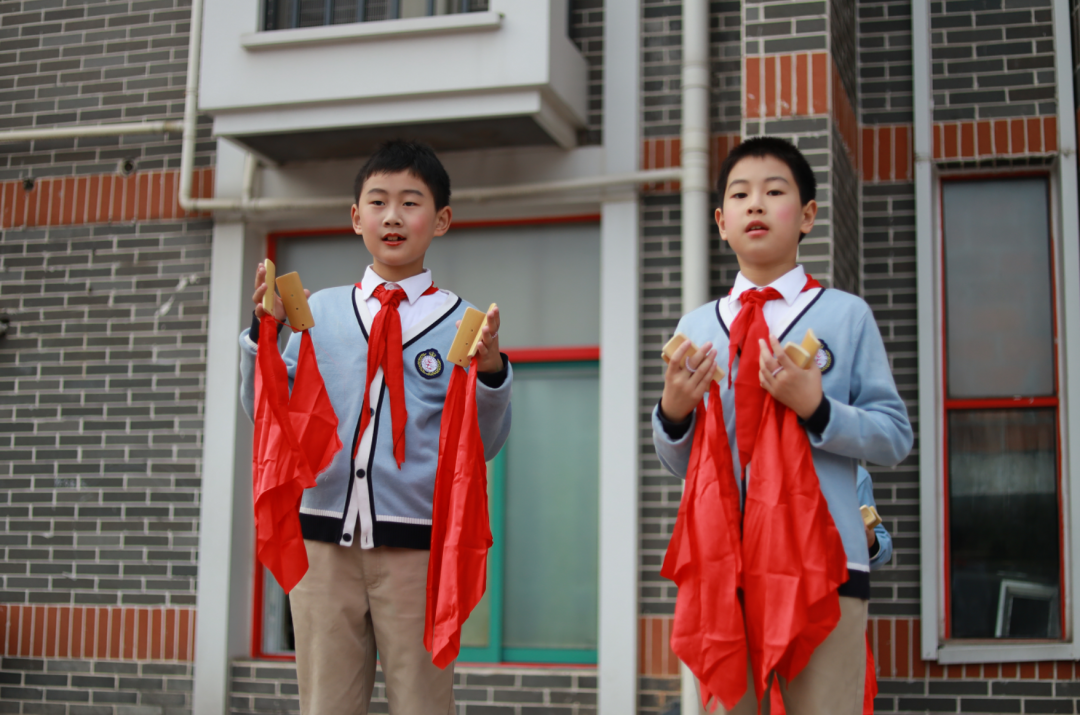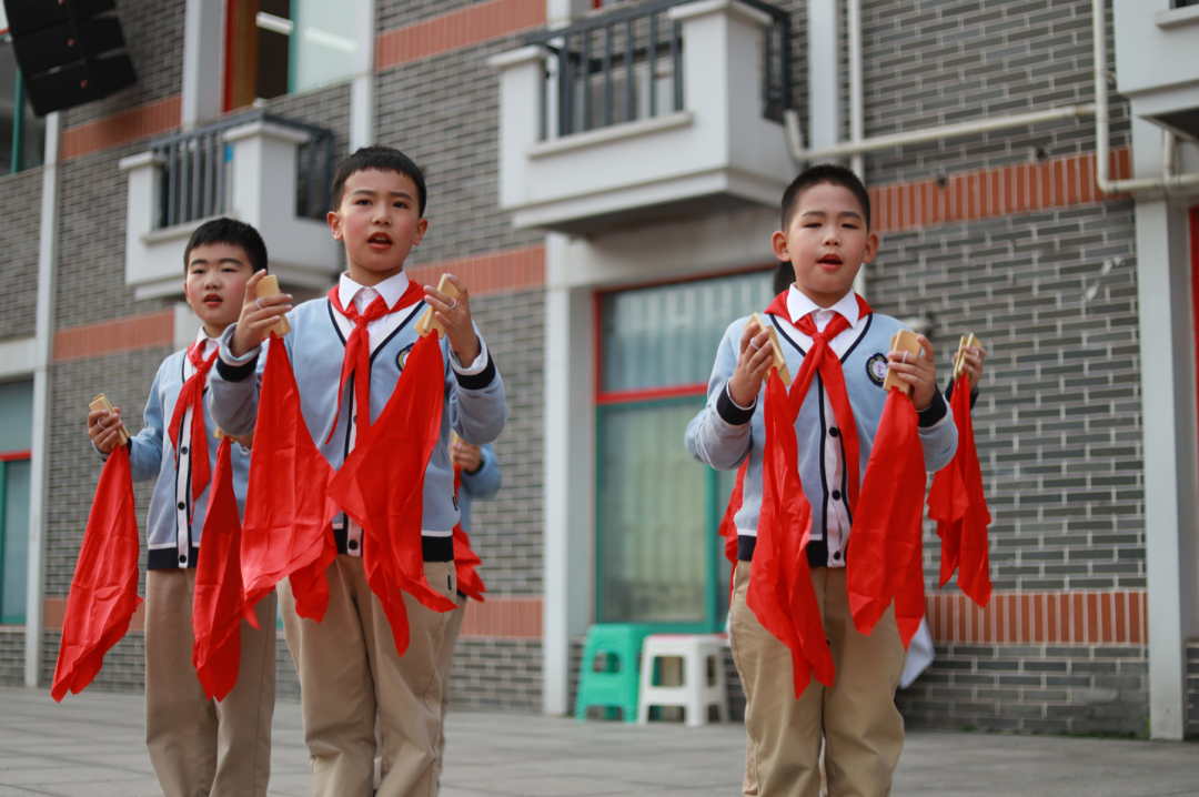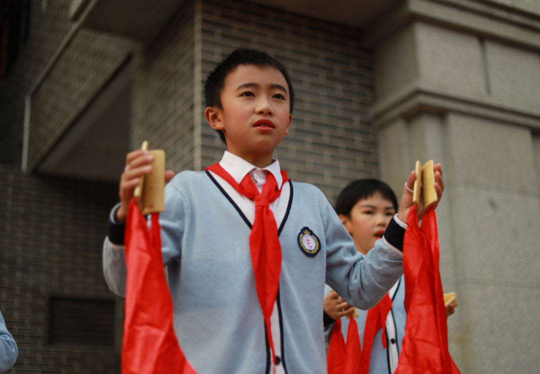 02听!整个舞台快板声此起彼伏,男生们人手一副快板,化身“节粮”宣传员,个个精神抖擞,动作整齐划一,光盘行动的倡导口号从孩子口中流出,别有一番风趣。