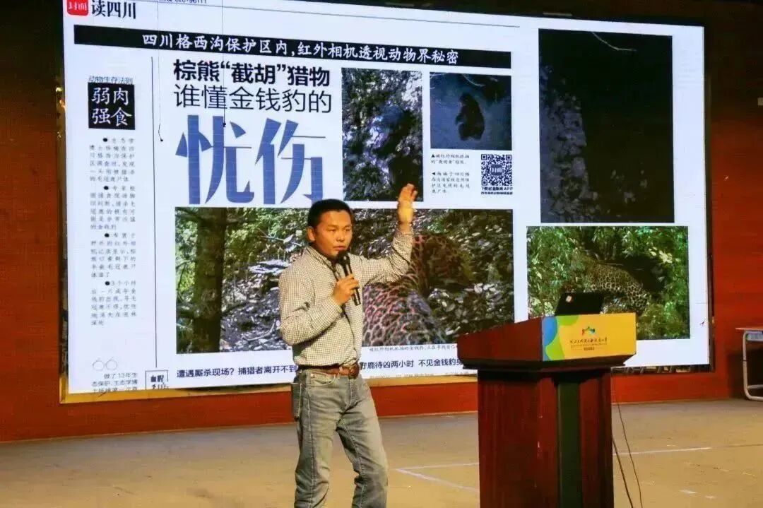 西南民族大学杨楠博士带来了主题为《青藏高原 野生动物王国》的讲座,将活动推向高潮。杨楠博士通过自身的丰富经历和一张张真实的动物照片,一个个实地动物影像资料,如数家珍地和同学们展开了精彩的交流互动,犹如亲临其境。“谁是凶手”“喜马拉雅山到底有没有野人”“野外遇到熊怎么办”“鹿角是被恶人砍掉的吗”……一个个问题大大激发了孩子们对野生动物的好奇心和求知欲。
