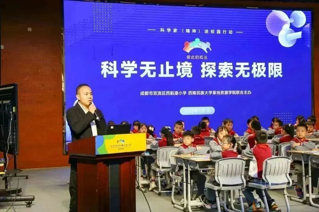 科学无止境,探索无极限。2023年11月1日,成都市双流区西航港小学携手西南民族大学草地资源学院开展了科学家精神进校园活动。西南民族大学草地资源学院党委书记泽茸足,学院党委副书记、副院长杨丽雪一行,双流区教育局科技与信息化科副科长王斌,西航港小学党支部书记、校长夏伶俐及行政团队、教师、四年级全体学生及家长代表400余人参加了本次活动。