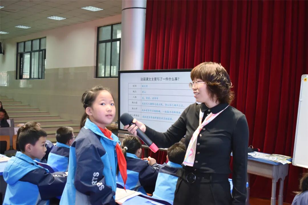 接下来,易红玲老师带来《爬天都峰》精讲点拨课。易老师紧扣本单元语文要素“了解作者怎样把事情写清楚”,首先利用表格回顾文章主要内容和写作顺序,进而提出本节课的学习目标。接着聚焦爬山过程,通过抓住重点句、圈关键词,品读感悟的学习方法,品读爬山前的句子,认知作者写清楚爬山过程的方法。接着运用学习方法实践学习“爬山中”,“爬山后”是如何把爬山过程写清楚的。然后整合了本单元的初试身手,让学生尝试运用方法,把比赛过程写清楚。课堂中老师循循善诱的引导,让语文学习既有学习方法的传授,同时也让学生浸泡在语言文字中,通过朗读去体悟、感受,让课堂充满语文味。最后,学生结合学习目标进行自评。整节课学生在老师的引导中,表现得越来越自信。