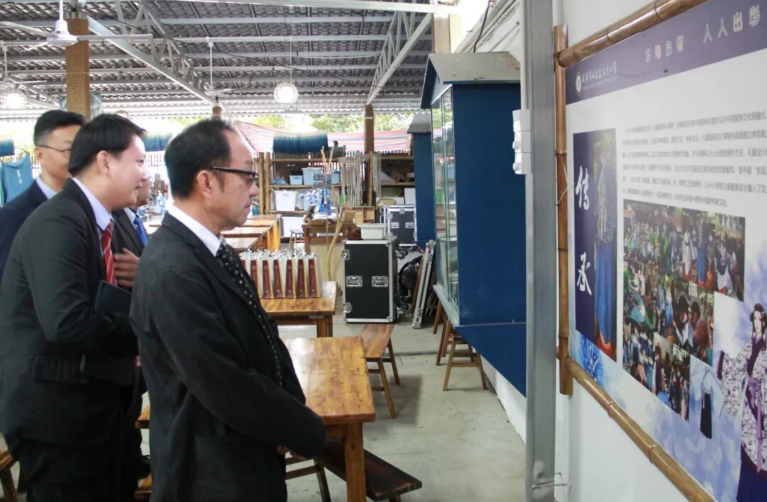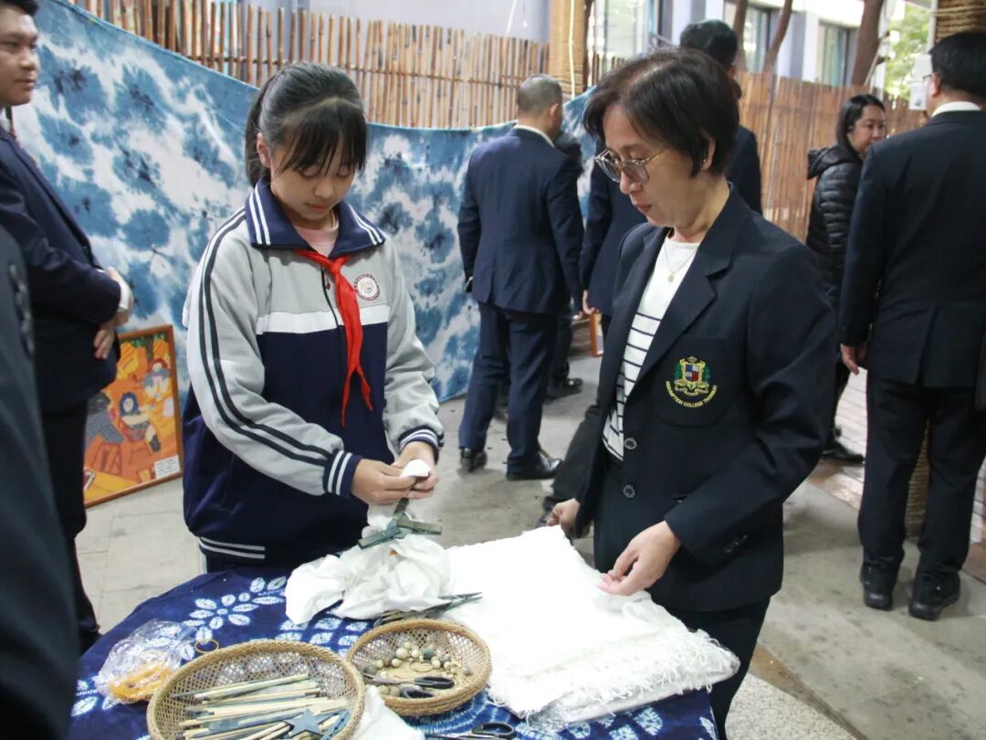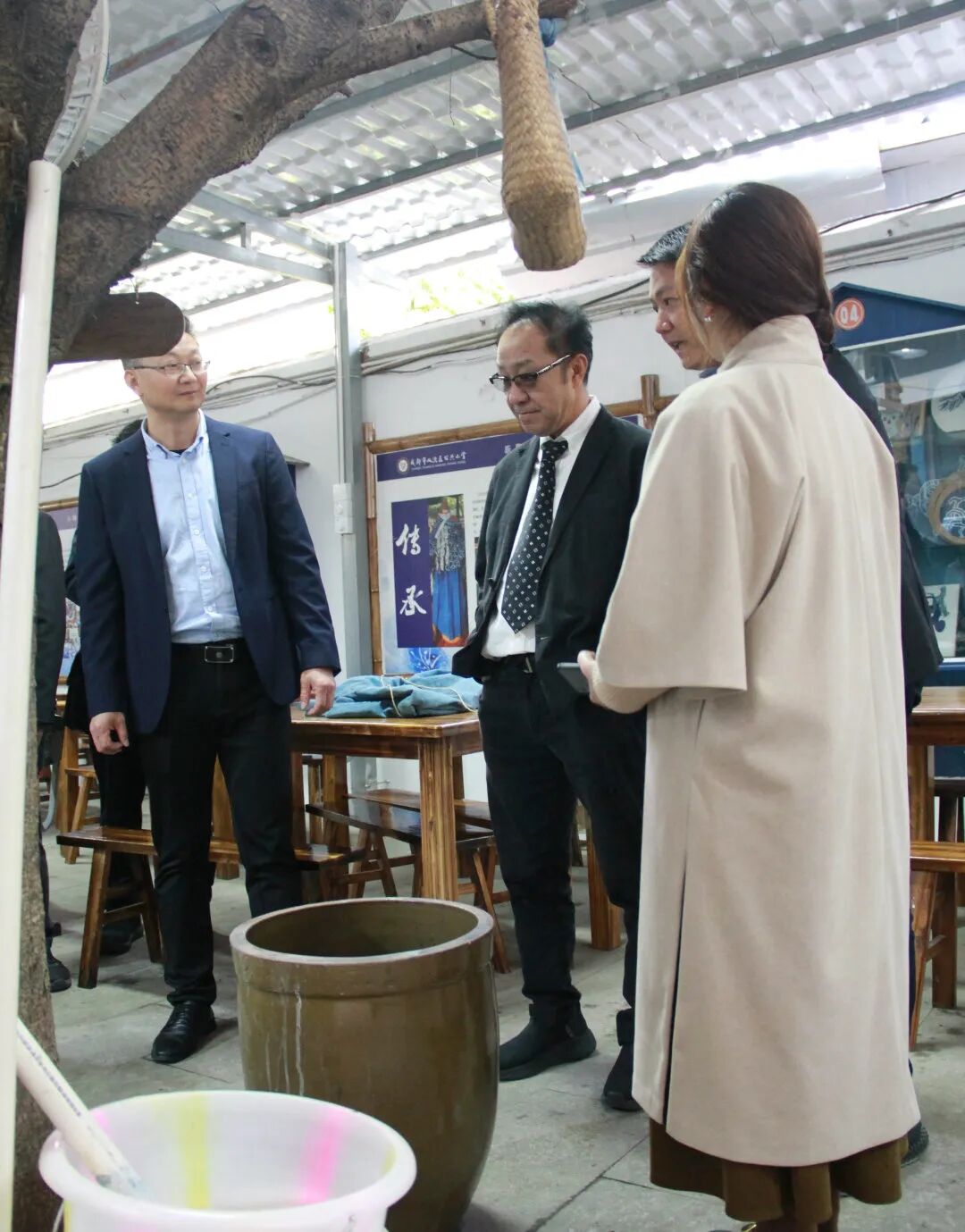 接着,访问团来到了学校的蓝染房,看着孩子们扎染出来的披风、扇子、衣服等优秀作品,纷纷赞不绝口。