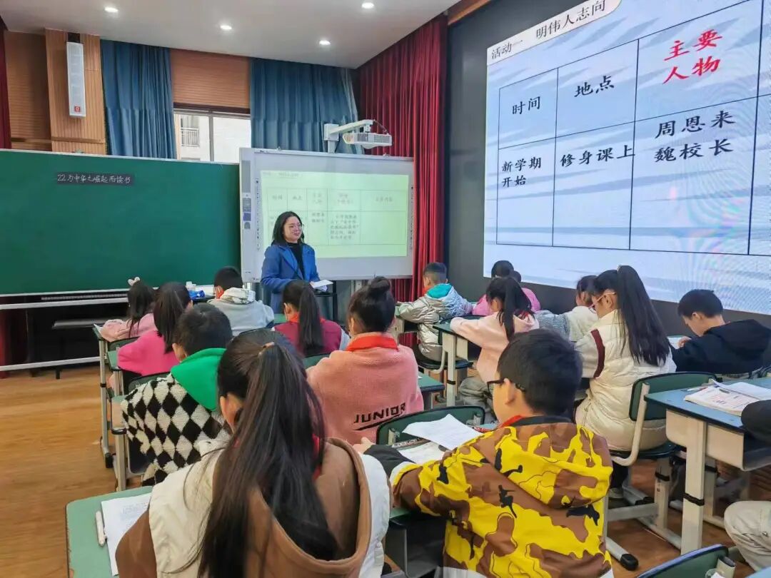 廖老师首先聚焦本单元“家国情怀”主题,接着借助“明伟人志向”“寻志向来源”“传伟人事迹”三个活动,引导学生关注主要人物和事件,把握文章的主要内容。整堂课以大单元任务为驱动,体现了“语文课程是工具性与人文性的统一”这一理念。