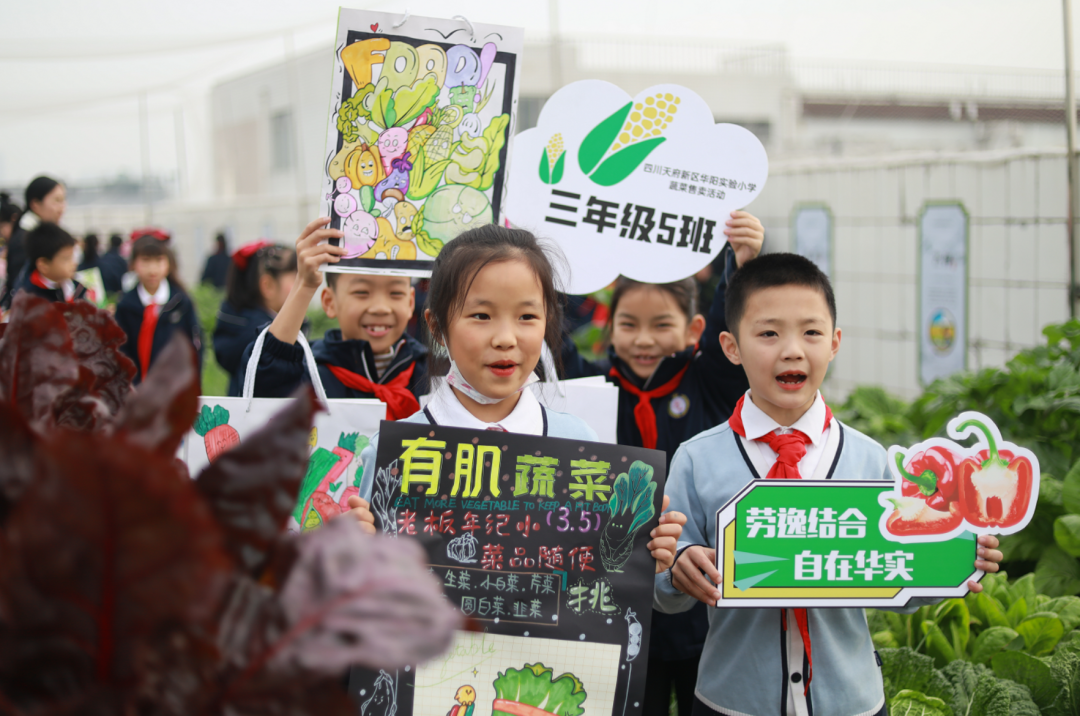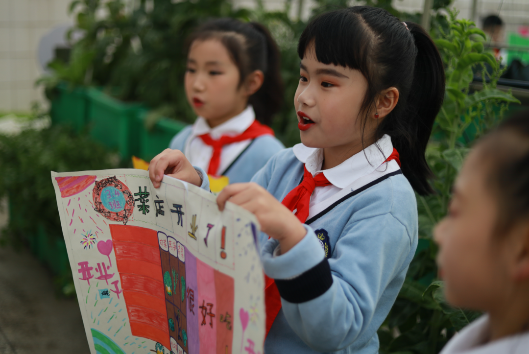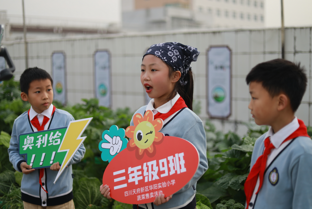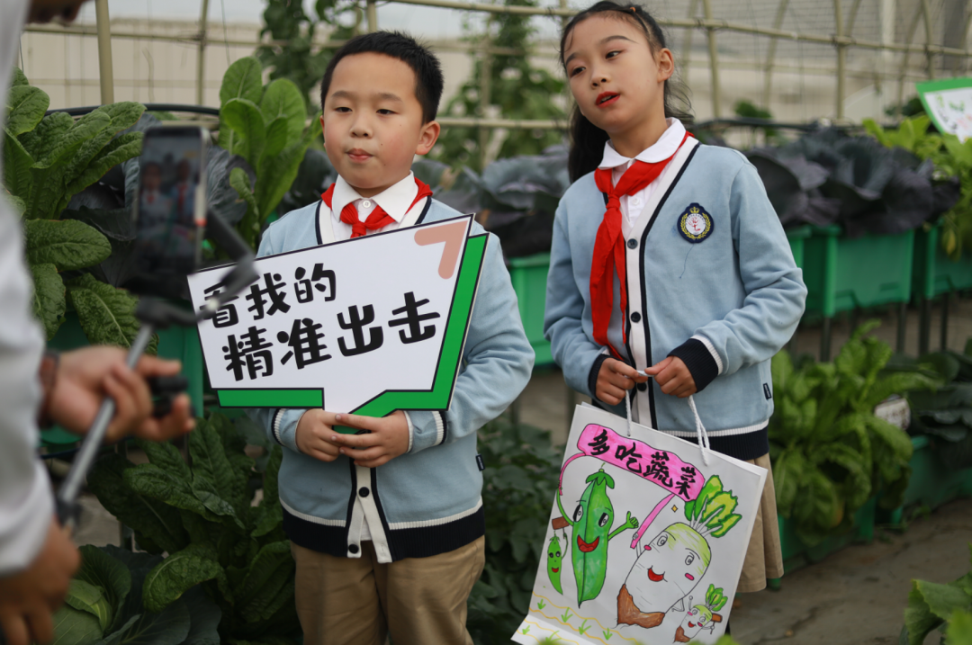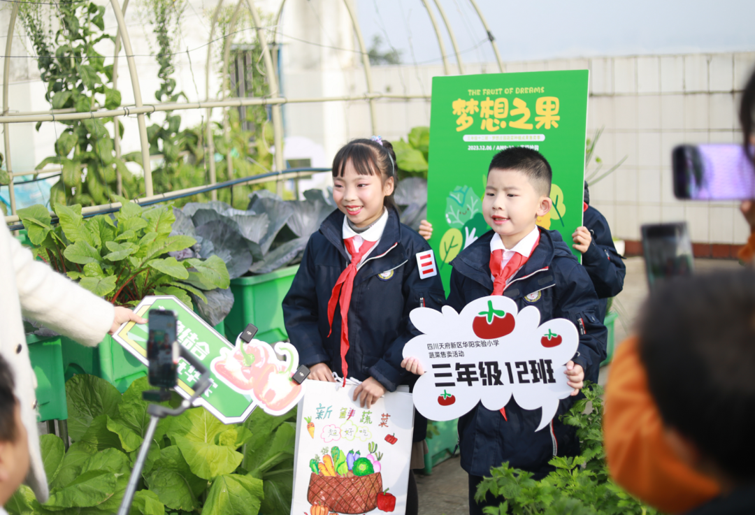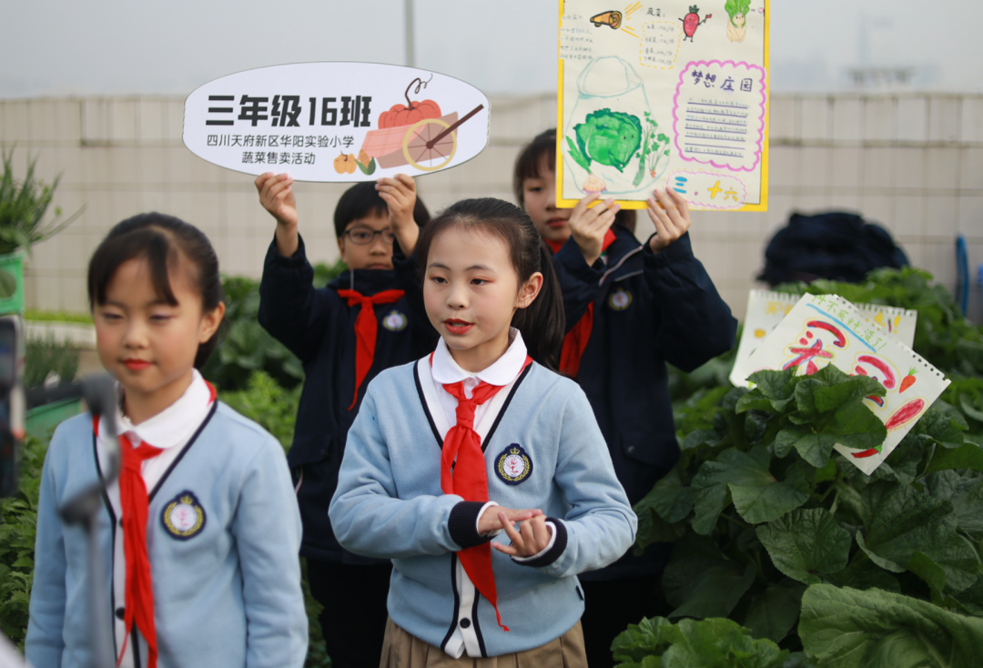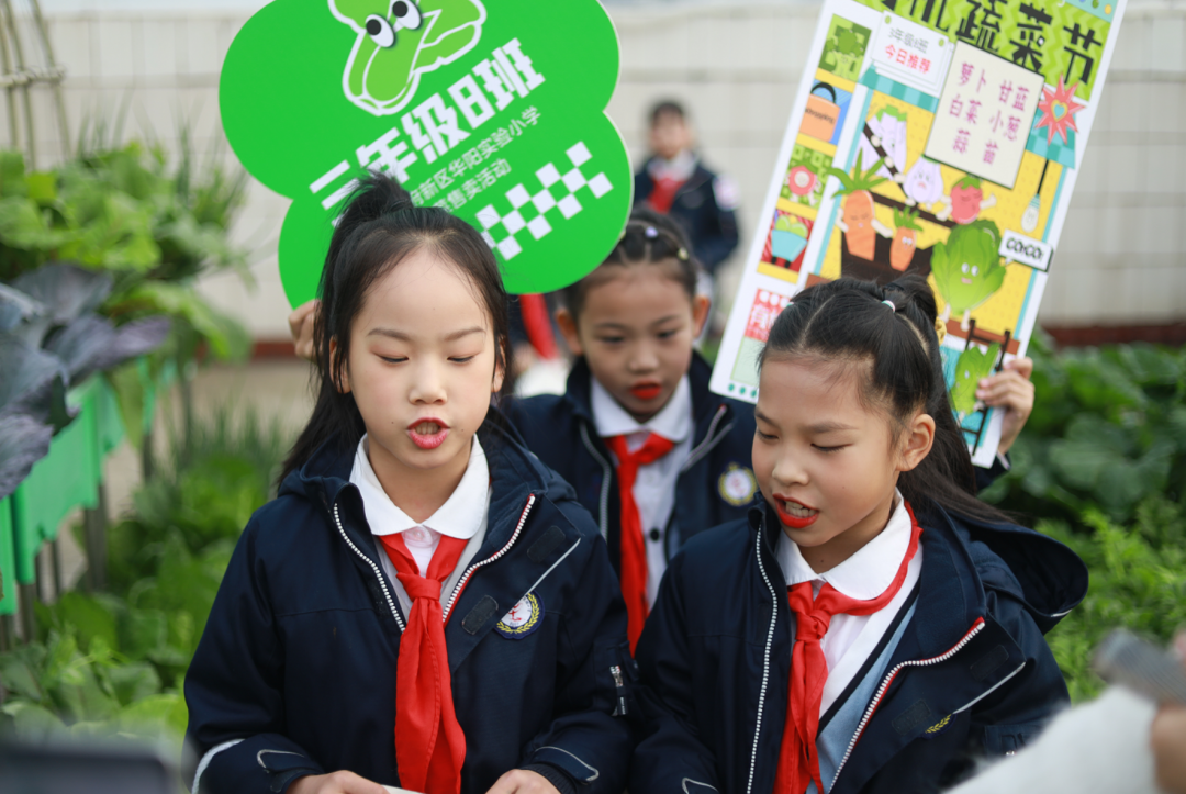 “欢迎来到华阳实验小学直播间!3、2、1,上链接!”“走过!路过!不要错过”“无公害,无污染,欢迎选购!”“这是我们班基地种的蔬菜,芥菜、大白菜、芥蓝,很新鲜,买点回去尝尝!”……