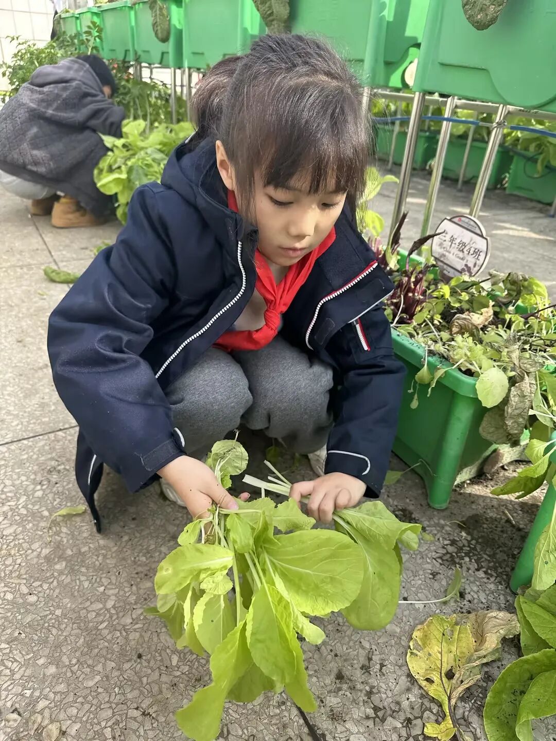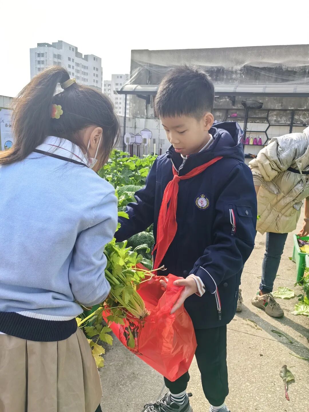 抢购结束后,孩子们就开始按照订单进行蔬菜的采摘、打理、分装,并扮演“小小快递员”,开始订单“派送”。瞧!孩子们采摘和装袋多么认真仔细,这是他们用一滴滴勤劳的汗水浇灌出来的劳动果实。紧接着,各个“小小快递员”便开始忙碌起来,将蔬菜派送给老师们、家长们。在采摘、分装和派送的过程中,孩子们逐渐锻炼了动手能力,体会到“一份付出,一份收获”的艰辛。