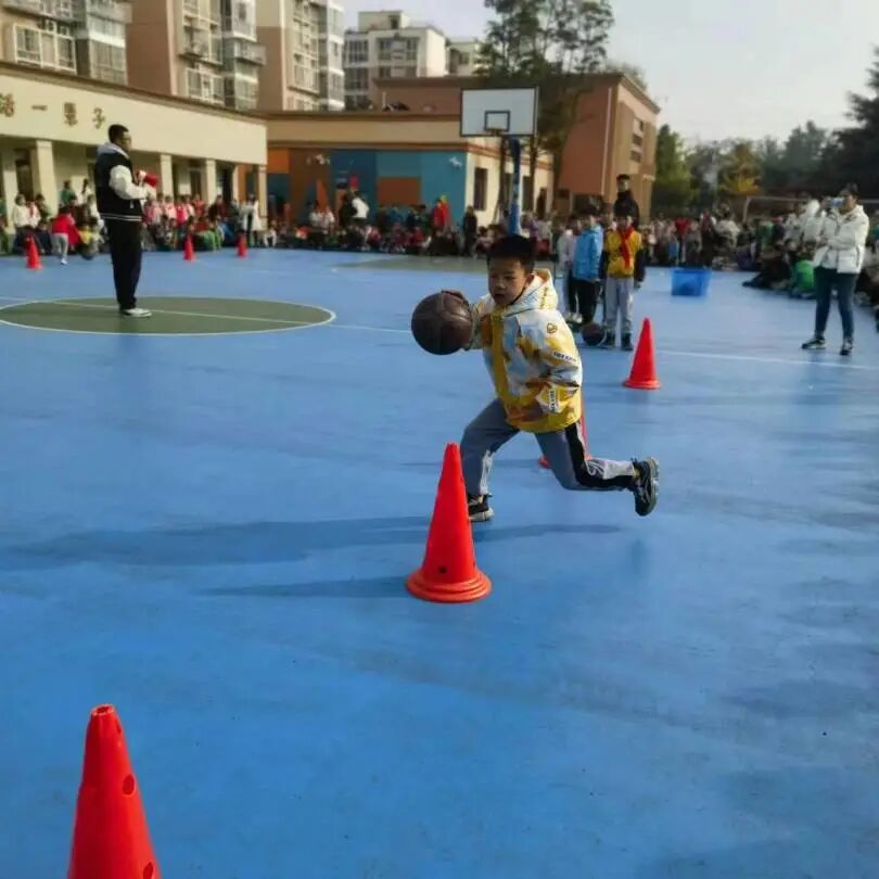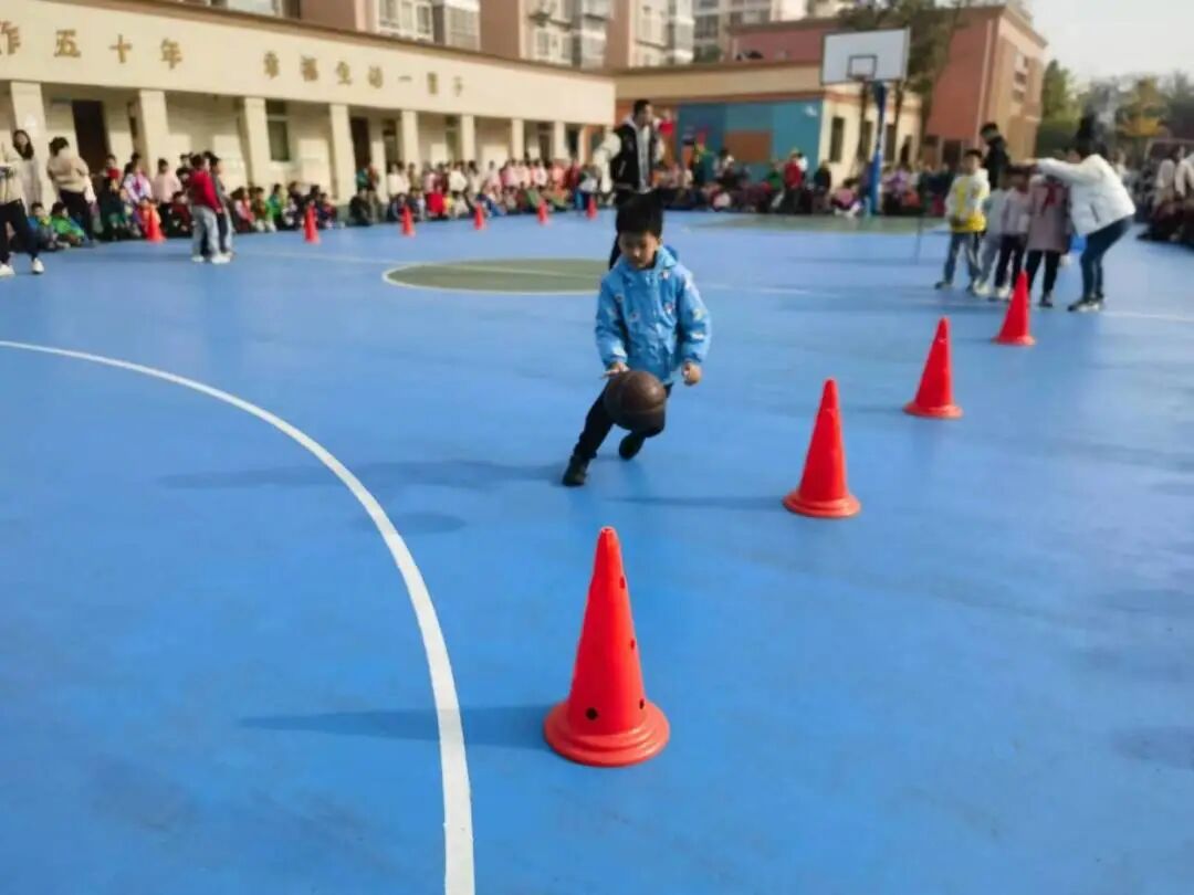 一次次运球穿越标志桶,一次次熟练的传球,运球接力承担着班级的荣耀,孩子们的脸上充满期待和对胜利的渴望。