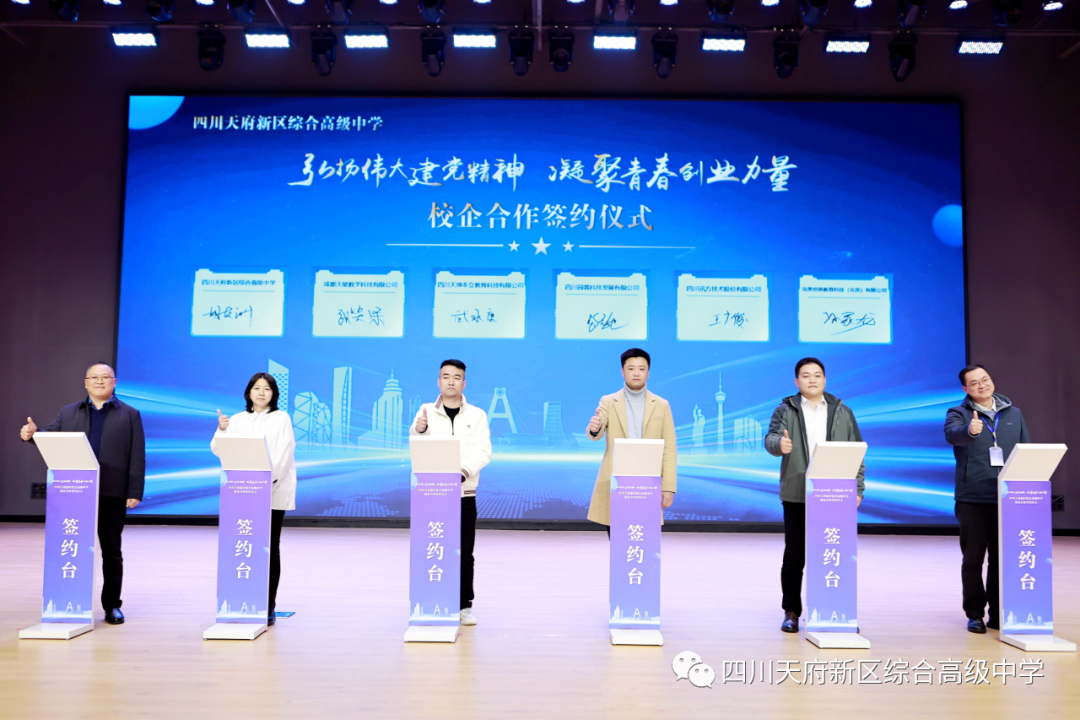 综合高中党委副书记、校长胡友洲分别与成都天星数字科技有限公司、四川天坤本立教育科技有限公司、四川园蓉科技发展有限公司、四川讯方技术股份有限公司、完美世界教育科技(北京)有限公司5家企业签订了《校企合作协议》。