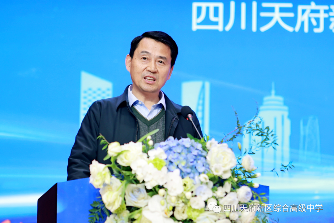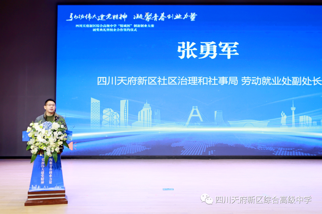 四川天府新区社区治理和社事局劳动就业处副处长张勇军表示,教育兴则国家兴,教育强则国家强,作为国家级新区,天府新区始终坚持教育优先发展,锚定省级教育综合改革试验区建设,坚持服务人才、服务产业、服务营城导向,努力办好人民满意的教育,有利支撑新区创新发展。希望综合高中以创新创业大赛为契机,将优质的产业资源、科技资源、企业资源转化为教育资源,努力把学校建设成为全省首创的综合实力强、人才培养质量优、社会认可度高的全国现代化融合育人典范,引领和带动新区教育高质量发展。