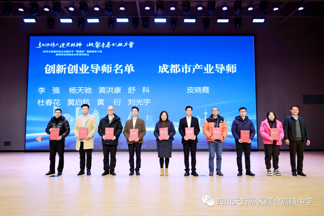 为充分发挥学校内外高层次人才作用,助力学生提升创新创业能力,深化产教协同育人,活动现场,综合高中还为四川师范大学创新创业中心主任李强、四川园蓉科技发展有限公司总经理杨天驰、成都市数字经济协会副秘书长黄洪康、成都市产业导师皮晓霞等9名创新创业导师和产业导师颁发了聘书。