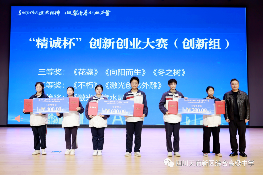 四川天府新区综合高级中学是成都市教育局批复成立,由四川天府新区高规格举办的一所公办全日制综合性高中。学校占地280亩,建筑面积19万平方米,于2023年9月1日正式开校,现有师生近4700人。学校立足国家级新区发展建设要求和首个省级教育综合改革试验区创新发展任务,聚焦服务学生多样化选择、多元化成才路径,坚持“为党育人、为国育才”初心,秉承“各尽其才 同奉其和”的教育理念,秉持“高规格建设、高品质办学、高定位发展”的总体思路,打造校园、公园、家园、产业园“四园同构”和产、学、创、培、研“五位一体”的办学功能布局,以共享理念促进教育多元融合,服务学术型、应用型、特色发展型等多类型人才成长需要,致力培养具有中国精神、国际视野、创新智慧的新时代青年领跑者。本次“精诚杯”创新创业大赛是综合高中成立后第一次面向全社会开展的创新创业活动,为综合高中实现多元融合办学,高质量推进高中阶段育人方式改革迈出了坚实的一步。
