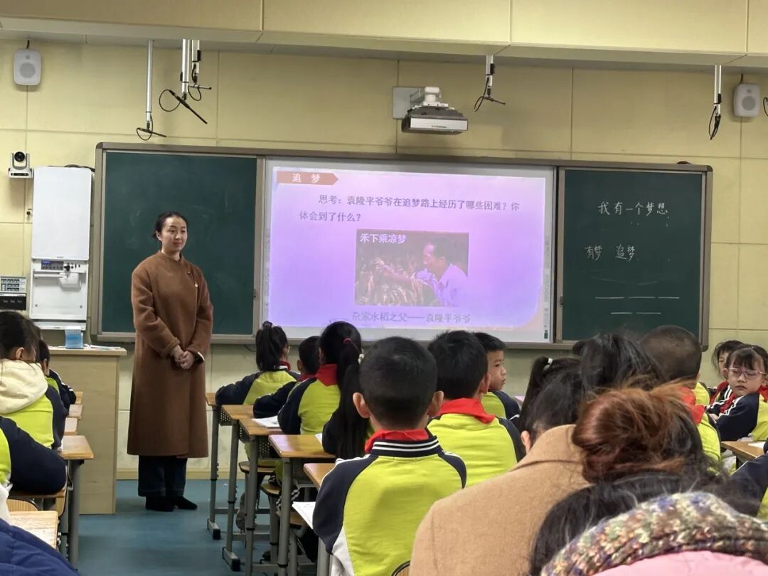 三年级的徐茂雪老师带领3.7班的孩子们以《习近平新时代中国特色社会主义—学生读本》中的一课《我有一个梦想》开启了与孩子们的追梦之旅。课堂上,徐老师通过“有梦——追梦——圆梦”三个环节来鼓励孩子们要有梦想,并为之而努力奋斗,最终实现自己的梦想。