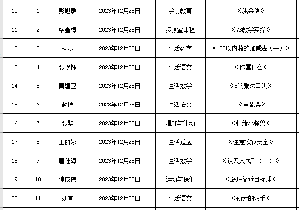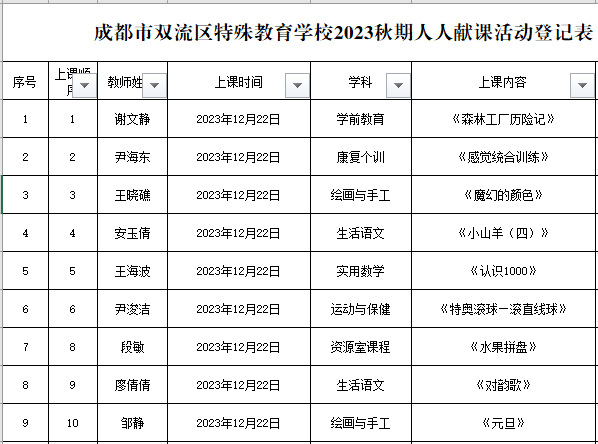学校共42位教师参与本次人人献课活动,共呈现42节优秀课例。参赛老师来自培智学前部、培智义务段、职业高中、聋生部和巡回支持部。涉及生活语文、生活数学、生活适应、劳动技能、绘画与手工、实用数学等培智课程,同时涵盖聋生部课程、资源室课程及康复个训等课程。
