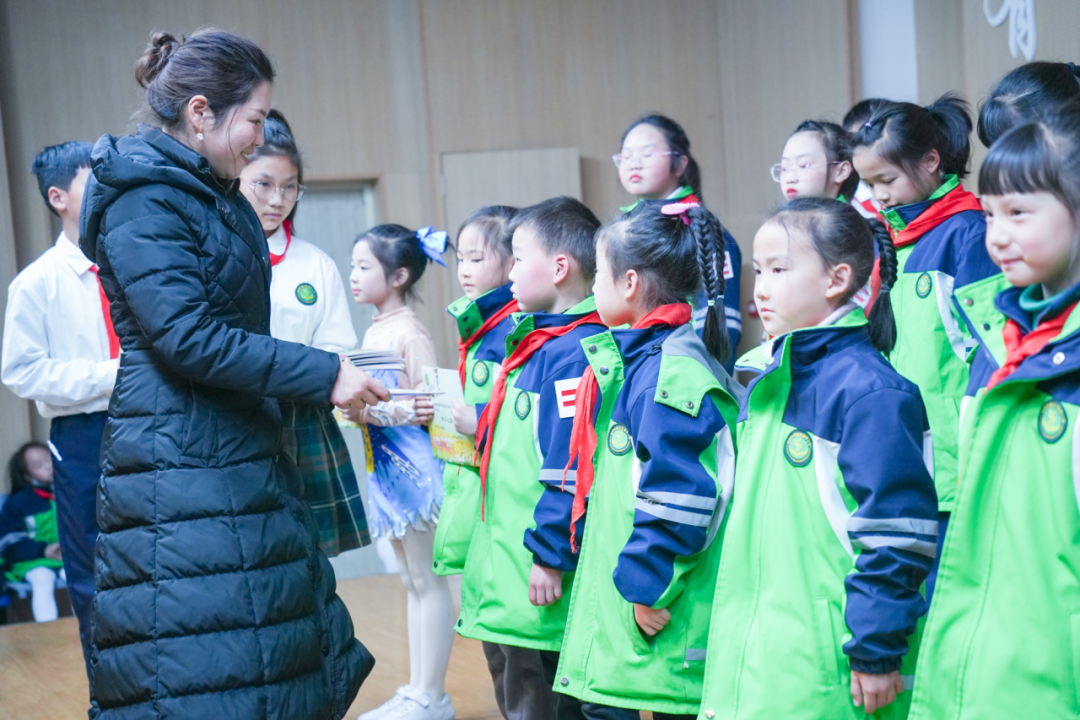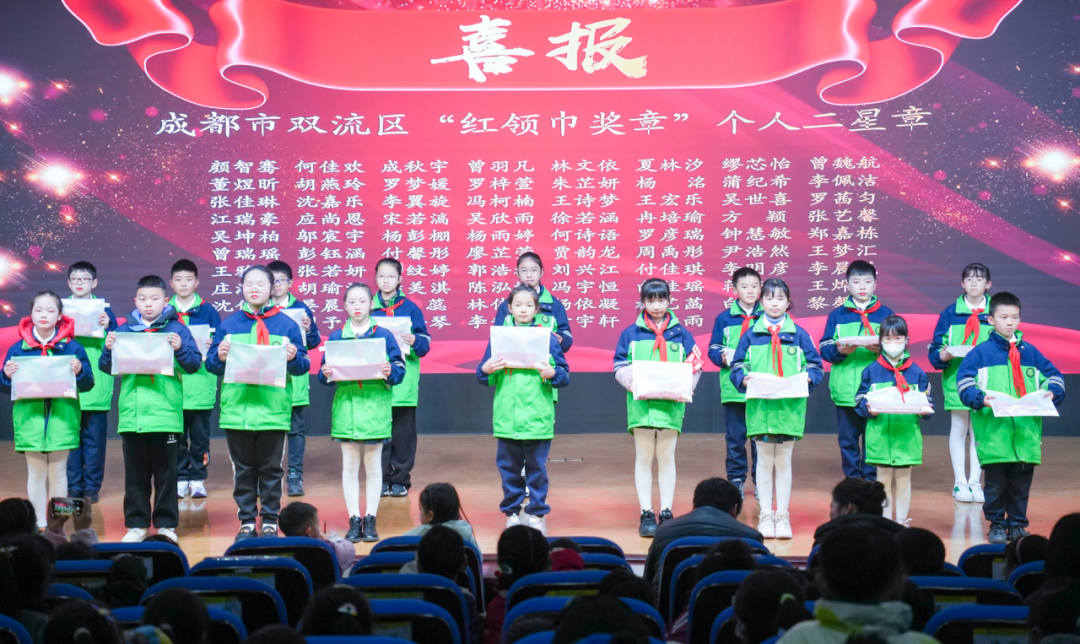 何浩副校长为获得双流区二星章班集体、优秀少先队员的孩子们颁奖。