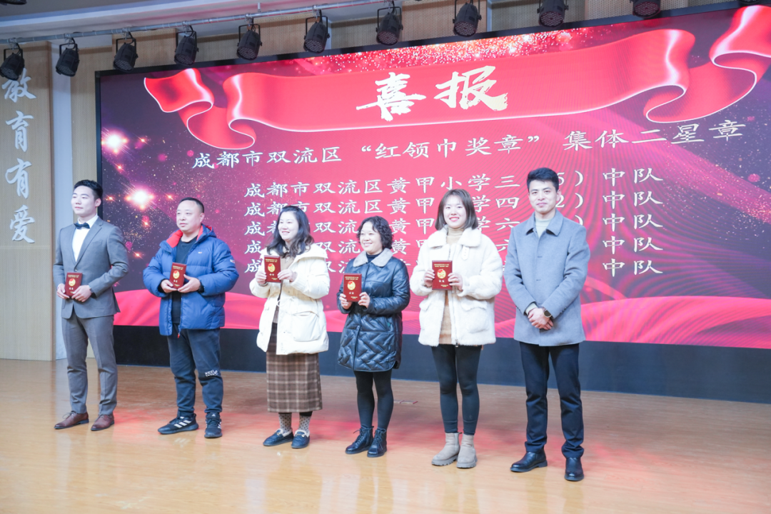程沙副校长为获得双流区黄甲小学优秀大队干部、优秀播音员以及品格之星的孩子们颁奖。