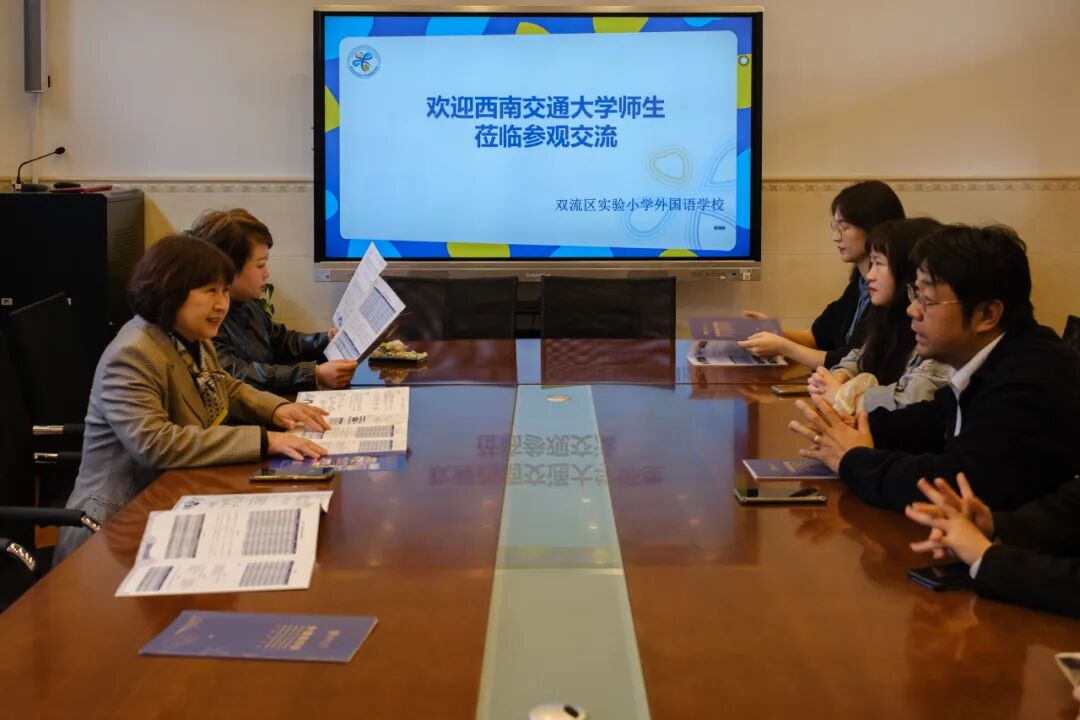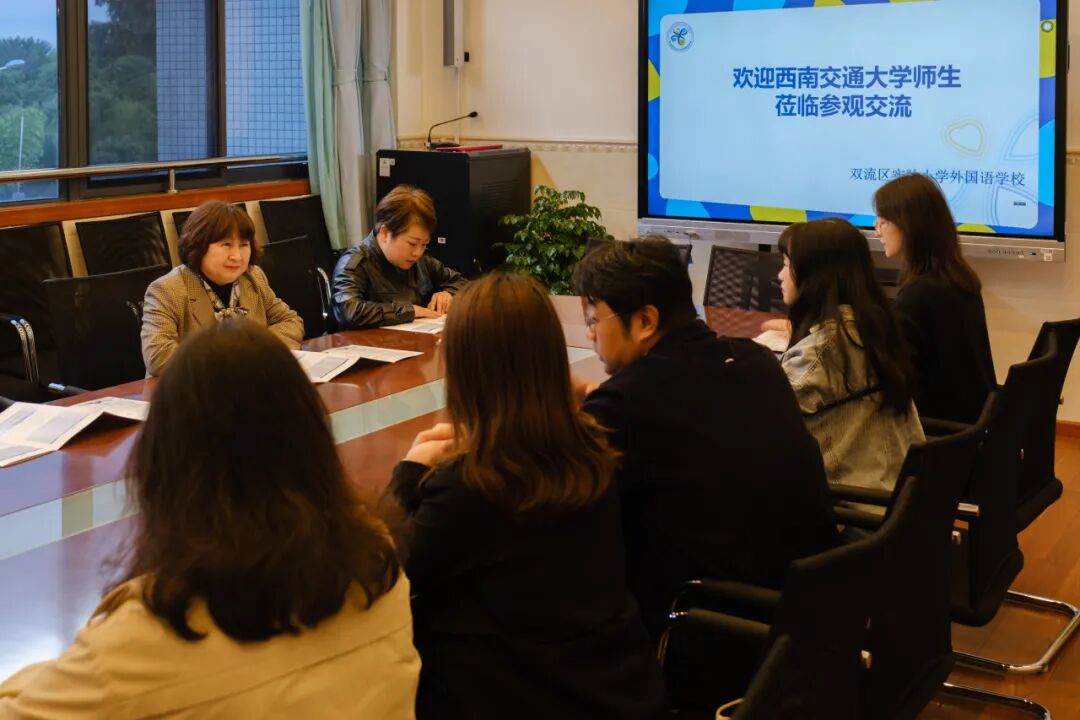通过对校园文化墙、教室、操场等实地参观和走访,西南交大外国语学院对双实外的办学历程、办学特色、教学设施建设等相关情况有了详细的了解。参观结束后,双方进行了深入的调研交流。学院党委副书记武俊向周校长介绍了学院专业设置、学科建设及人才培养情况,希望双方进一步开展深度合作交流,能为学院特别是英语、汉语国际教育类学生提供实习与就业机会。周校长介绍了我校理念文化、课程建构、教师队伍的培养发展模式等方面情况,并表示愿意持续深化合作交流,加强实习基地建设,为学生提供更好的实践教学平台。随后双方就学生就业实习基地建设等工作展开了深入交流。