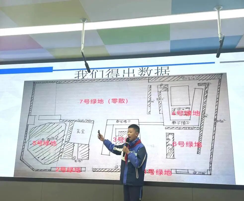 六年级数学组围绕“我们学校绿化面积是否达到国家标准?”这一核心问题,通过小组合作测量学校实际绿化面积、制作创意海报、总结实践研究等任务,培养了孩子们用数学的眼光观察世界,用数学的语言表达世界的素养,同时也增强了爱护生态环境的意识。