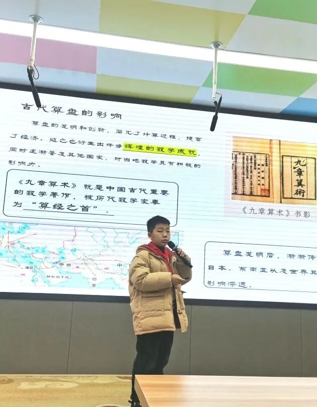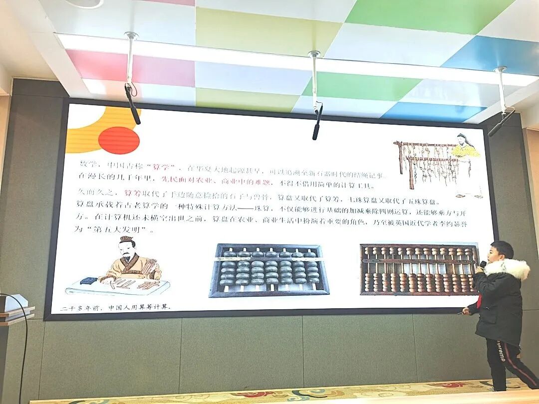 四年级数学组聚焦算盘的历史发展轨迹,将数学与历史、信息技术结合,引导学生经历中国计数的演变历程,了解算盘的起源、发展及影响,体会古人为了计数简洁而做出的改变与创新,感知中国古代数学文化的魅力。