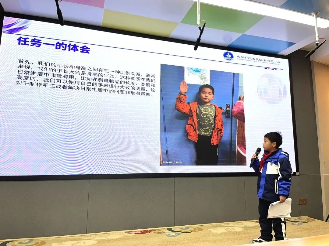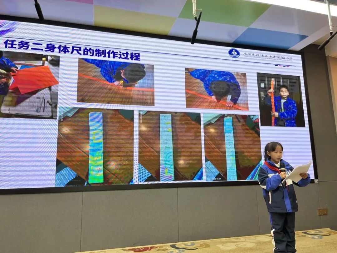 二年级数学组以身上的“尺子”为主题,将数学与语文、美术融合,设置了“认识并测量身上的‘尺子’”“运用身上的‘尺子’测量”“制作‘身体尺’”等任务,让学生在解决问题中,体会探究身上“尺子”的必要性。