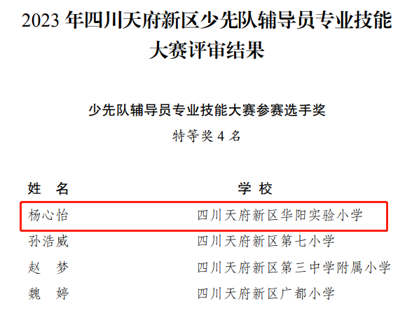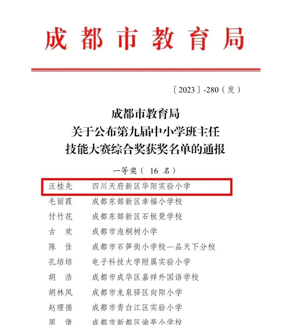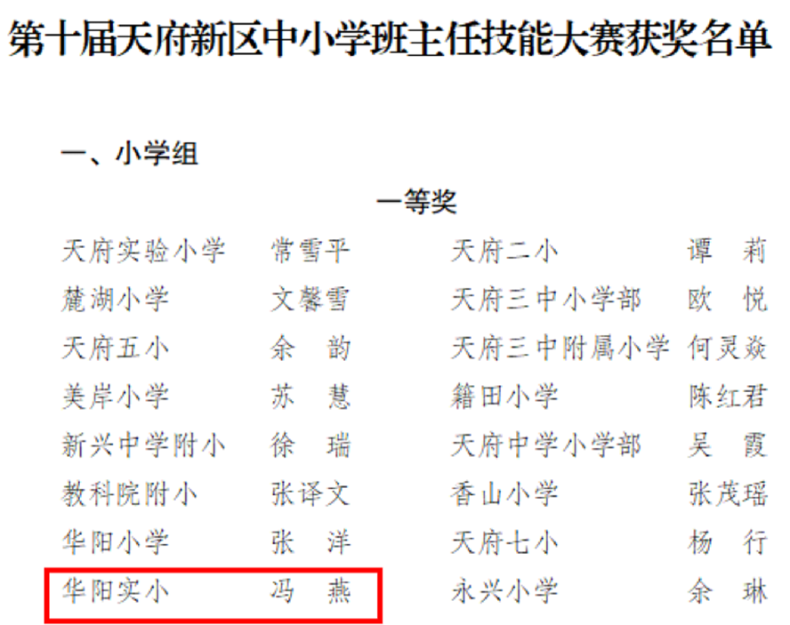 2023年10月,我校汪桂先老师参加了成都市第九届班主任技能大赛,最终收获一等奖的好成绩!2023年11月,我校杨心怡老师、蒋璐瑶老师参加了天府新区辅导员技能大赛,蒋璐瑶老师荣获天府新区辅导员技能大赛一等奖!12月,杨心怡老师代表天府新区参加了成都市辅导员技能大赛,最终获得一等奖第一名的好成绩!冯燕老师参加天府新区第十届班主任技能大赛获一等奖!
