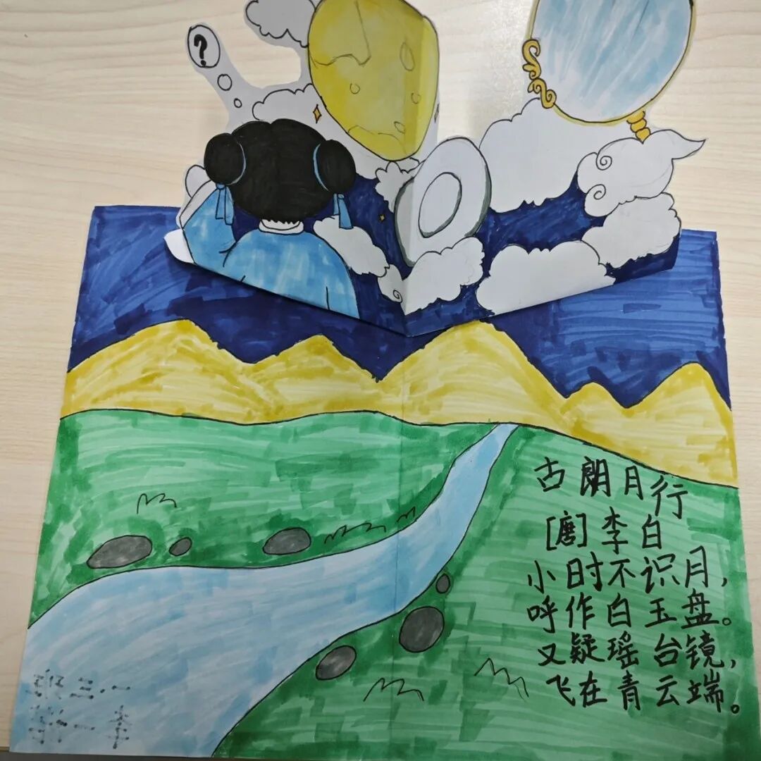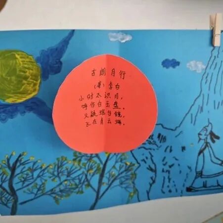 孩子们首先在语文课上学古诗,初步了解李白;接着在音乐课上学唱古诗,进一步熟悉李白;最后,孩子们通过美术老师的指导,在美术课上画古诗,做出富有诗意的立体书。