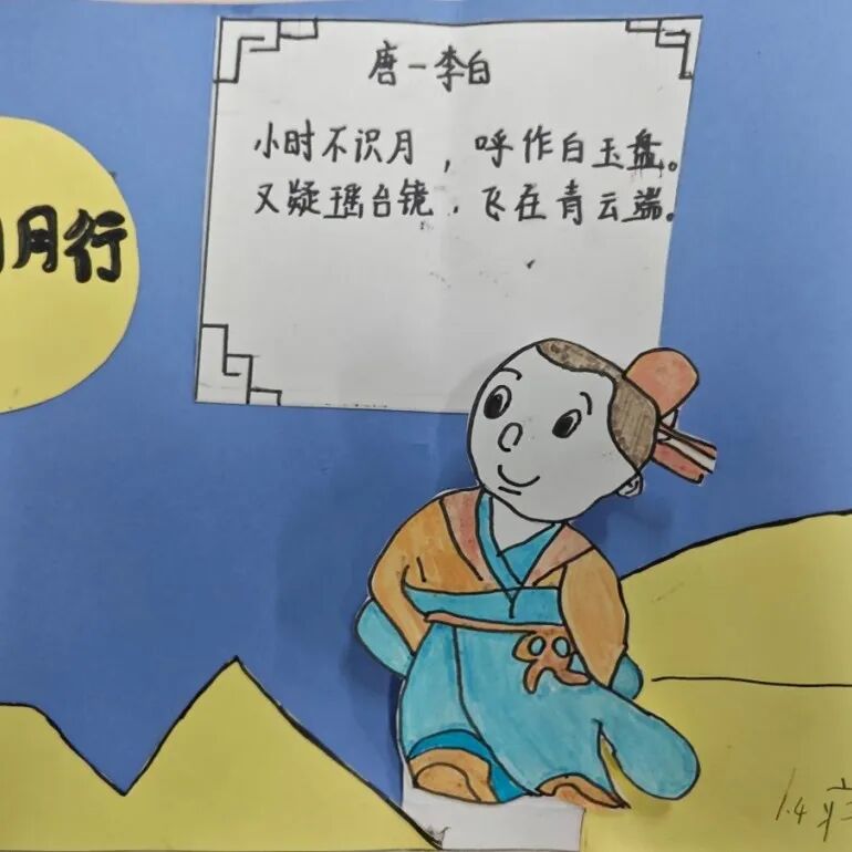 一年级以“和李白做朋友”为主题的活动,初步了解诗仙李白,以古诗《古朗月行》(节选)为切入口,诗仙以孩提时代对月亮稚气的认识,描绘了月亮的美妙与神奇。