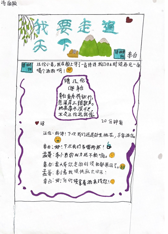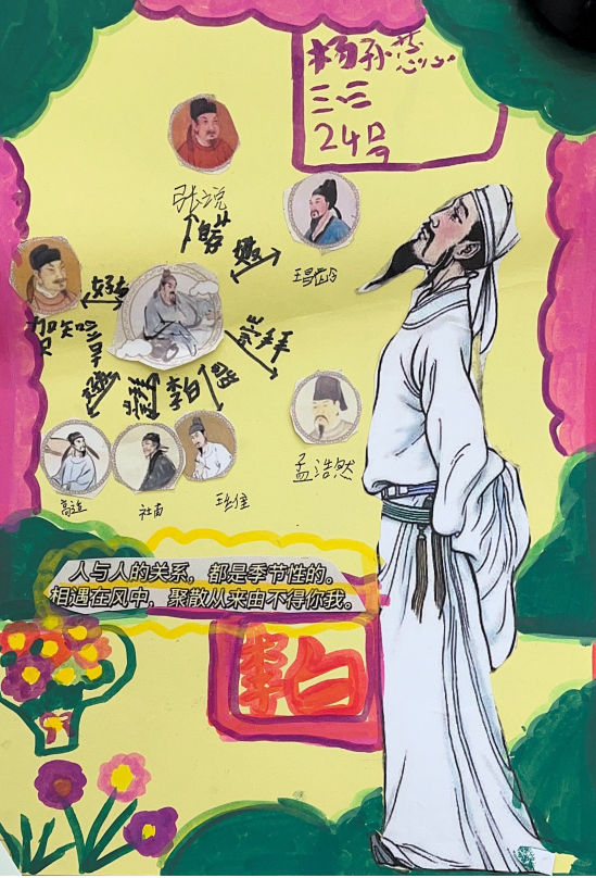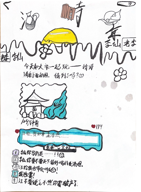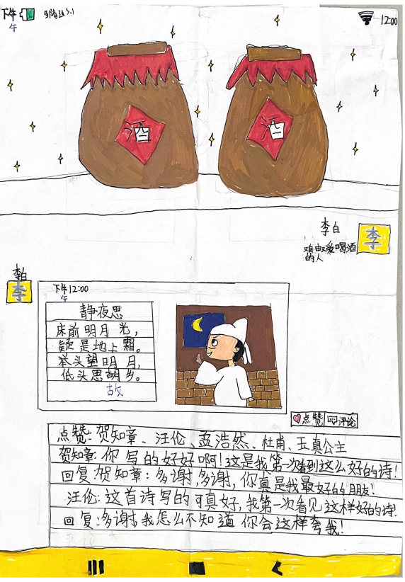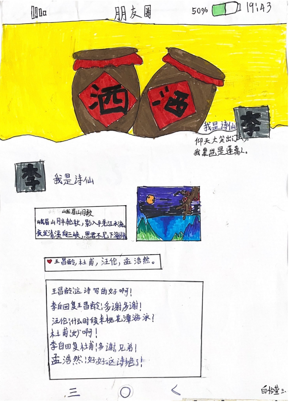 第三阶段为自主创作阶段,以“我了解的诗人”为主题,学生可以自主选择制作李白的朋友圈、梳理李白的生平和朋友圈、为诗人的经历画连环画、为诗人写诗等形式,表达自己对诗人的理解。
