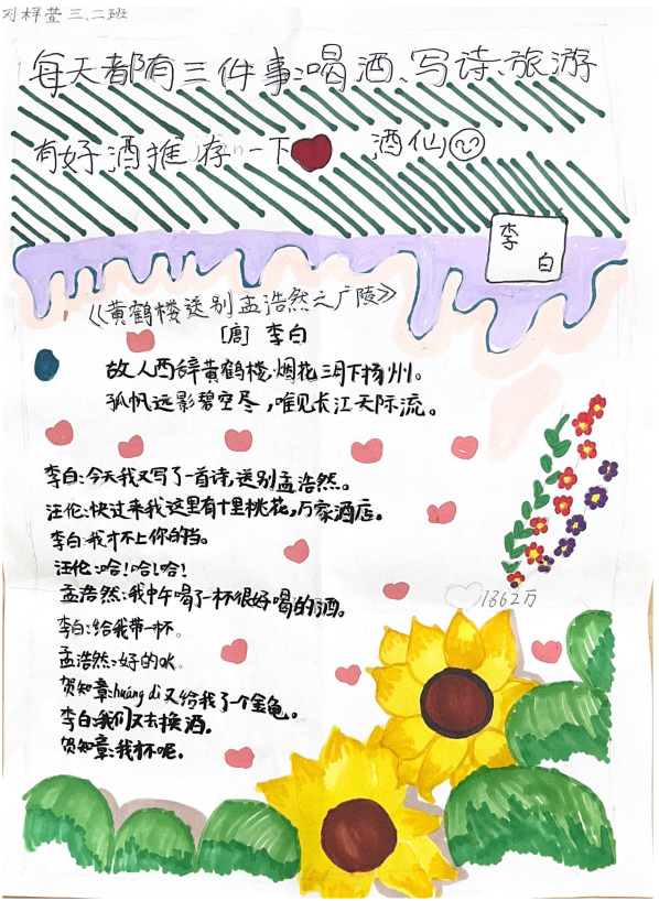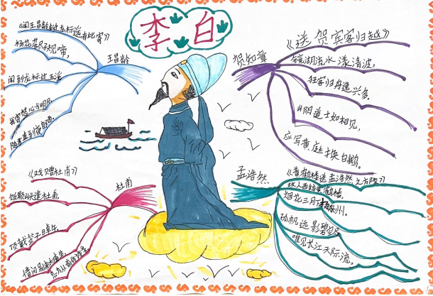 二年级以“走近李白”为主题,老师带领孩子们从李白生平,爱好以及诗歌中的意象等方面入手,走近诗仙。