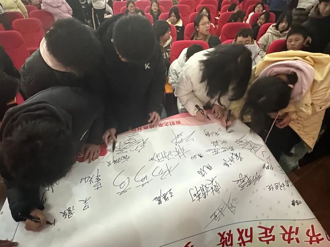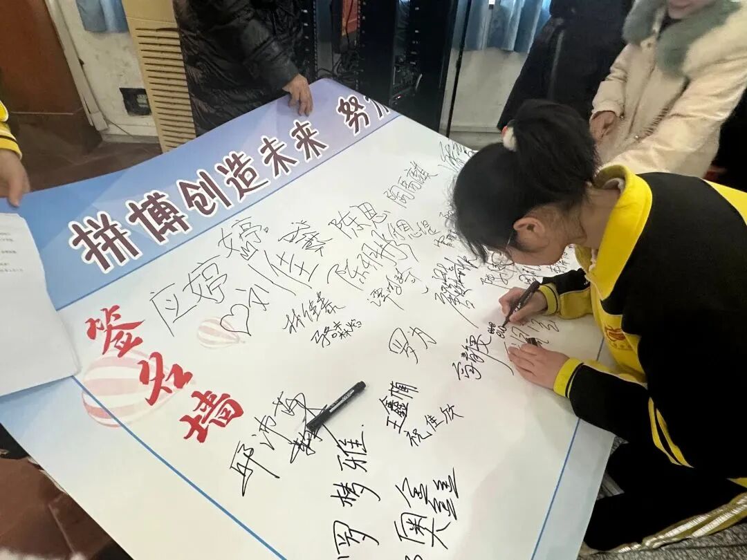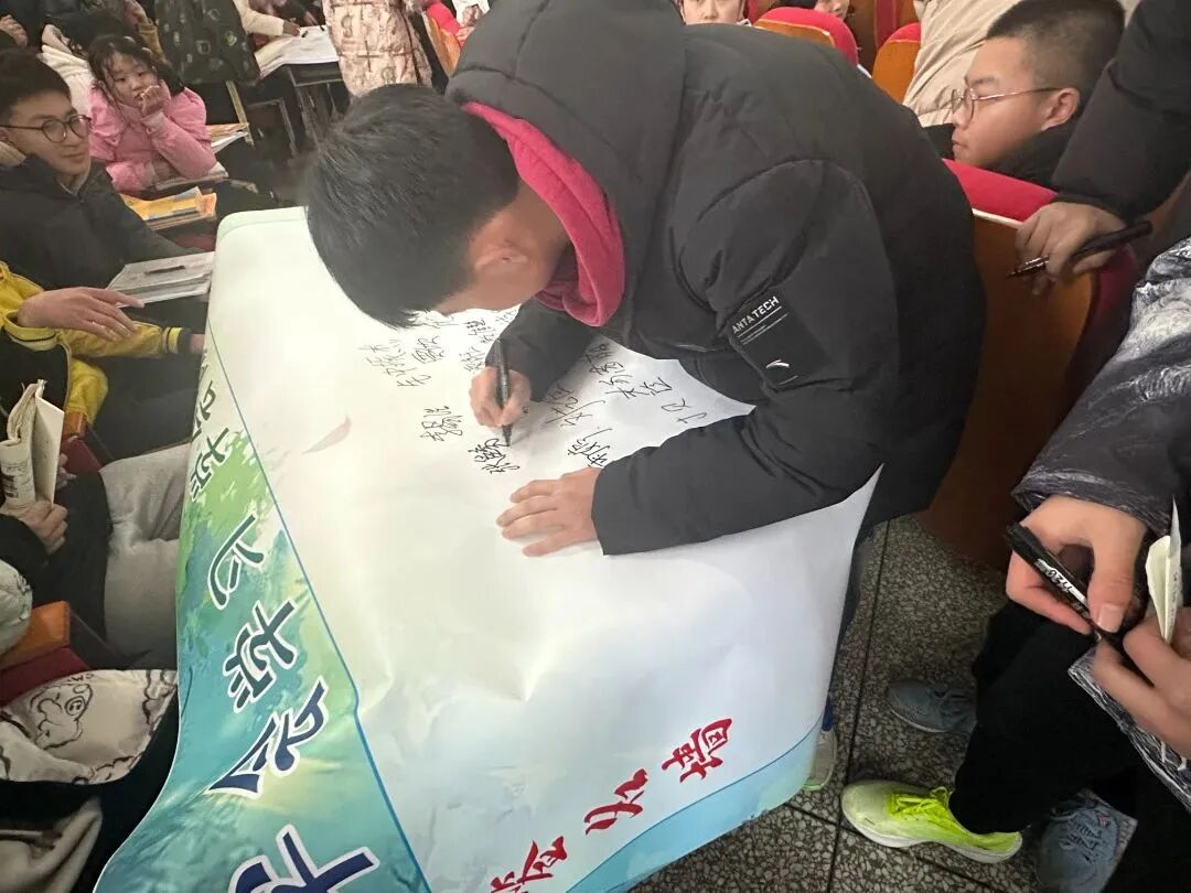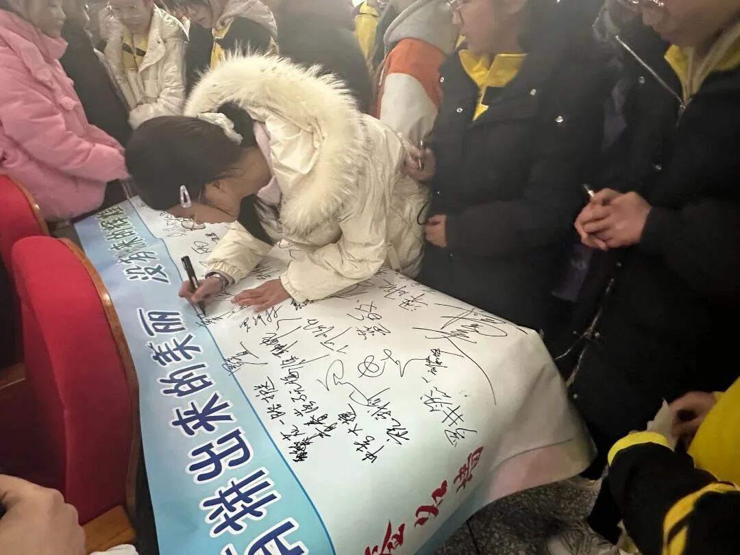 全体九年级同学的誓言震撼天地,他们付诸行动,不惧风雨。老师和同学们在中考励志板上一一签名。一个名字,信守一纸承诺,担起一份责任。