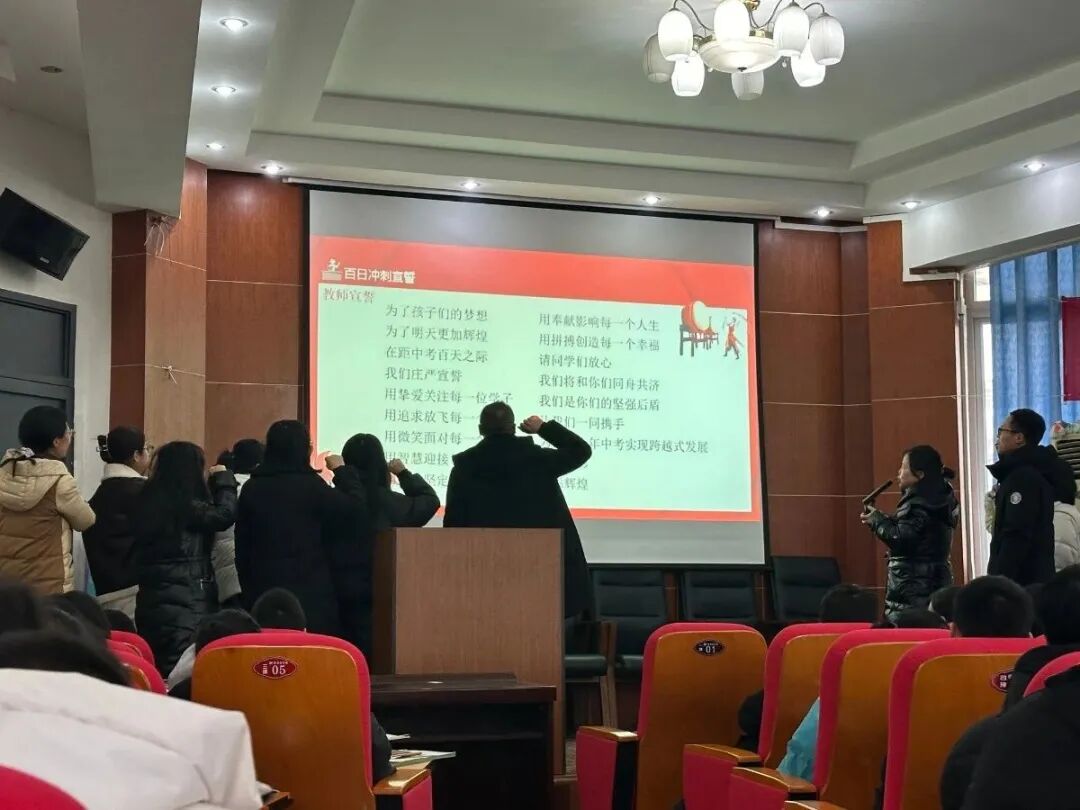 在年级组长游素清老师的领誓下,全体九年级老师庄严宣誓。和同学们同舟共济,一同携手,为我校今年中考实现跨越式发展,再添光彩,再创辉煌。