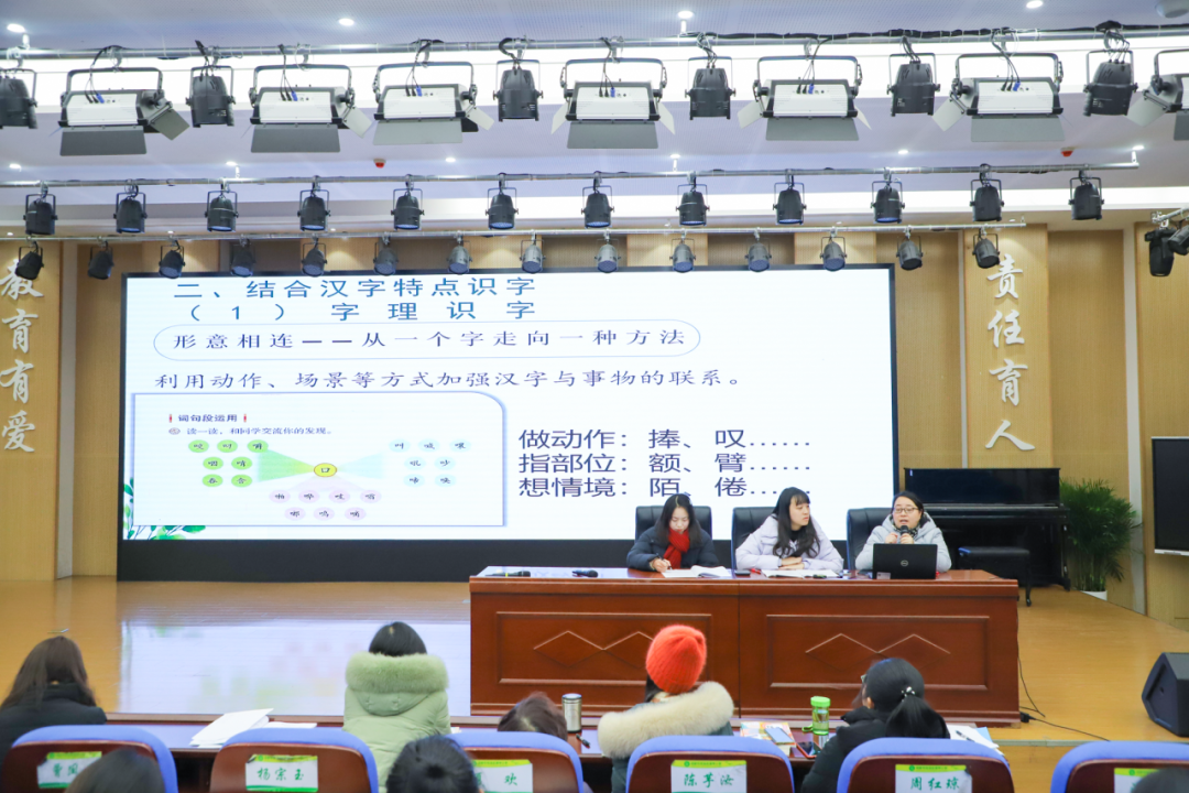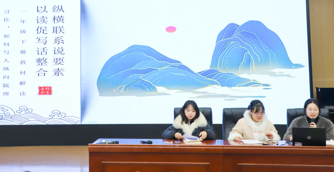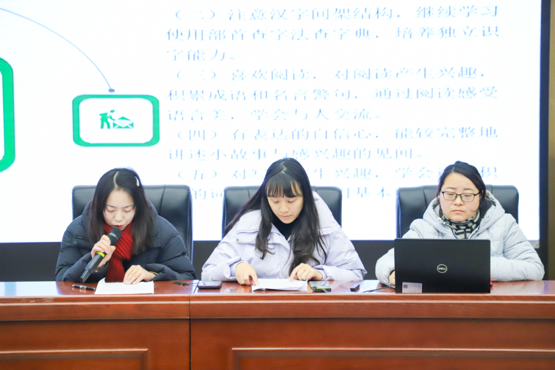 一年级组语文老师以《纵横联系说要素 以读促写话整合》为主题,解读了本册教材核心知识点的横向梳理、语文要素的落实方法等。同时,他们对“习作”这一板块进行了纵向梳理与方法建议。