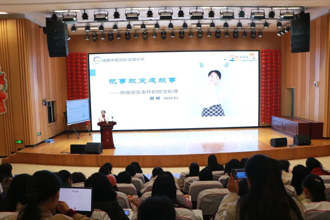 当下班级管理棘手问题越来越多,班级突发事件的处理考验着班主任们的智慧。棠湖小学的郭婷老师为大家带来了专题分享:《把事故变成故事——班级突发事件的智慧处理》,她从五个方面详细阐述了班级突发事件的处理流程,并结合自己的班主任教学实际事件进行分析,她告诉大家:班主任们用上爱与智慧,便能将突如其来的麻烦变为一次教育的契机。