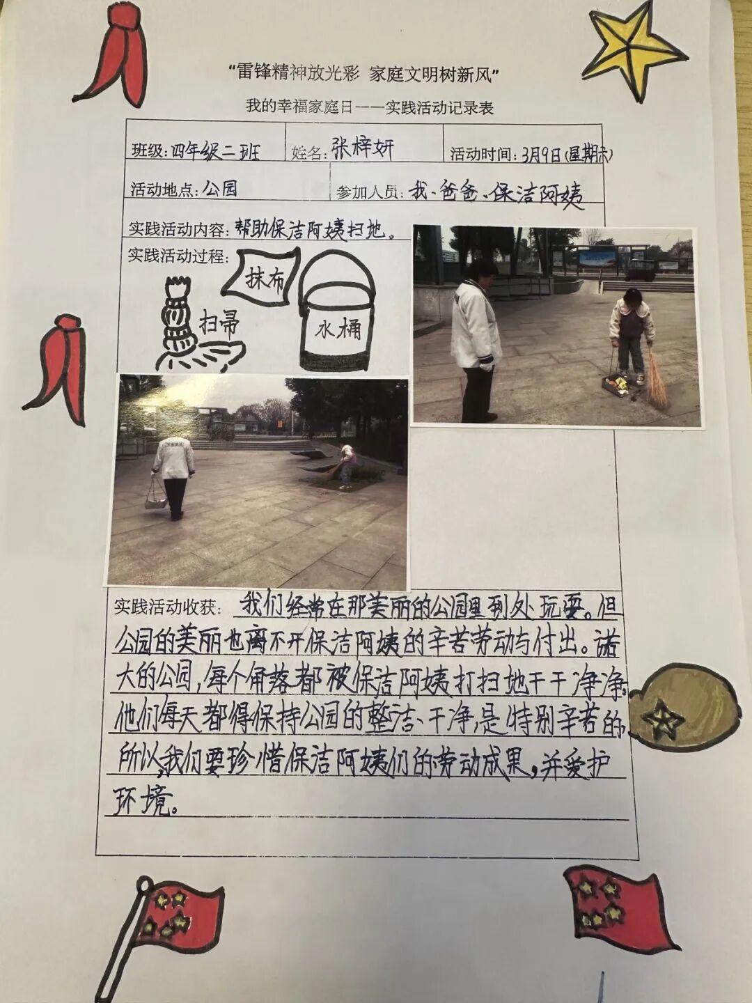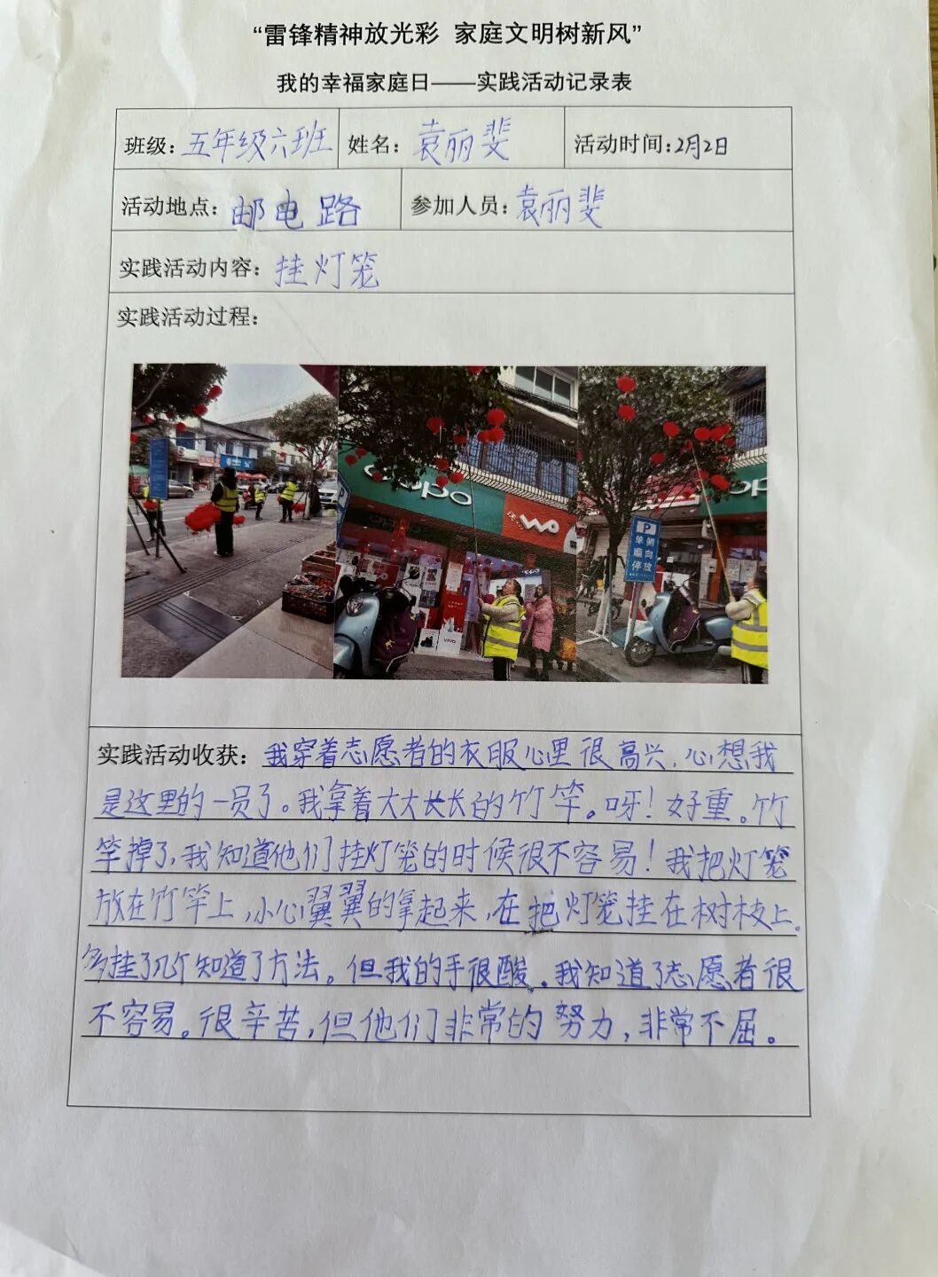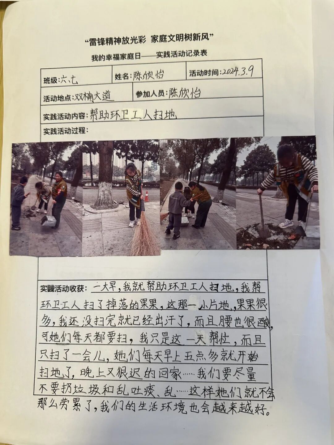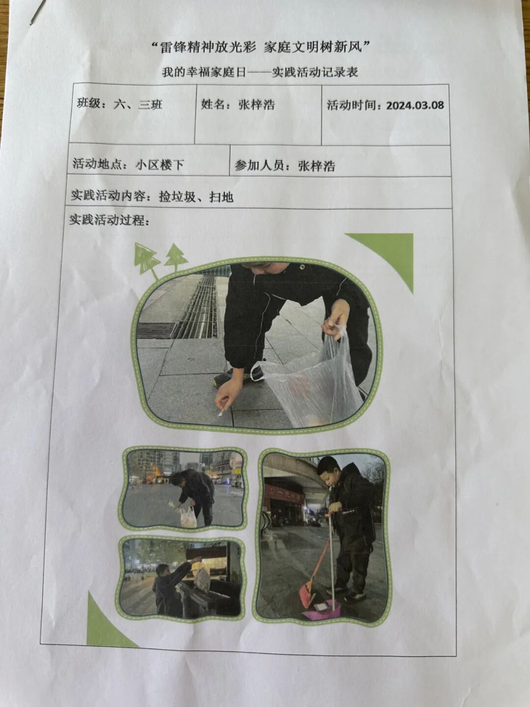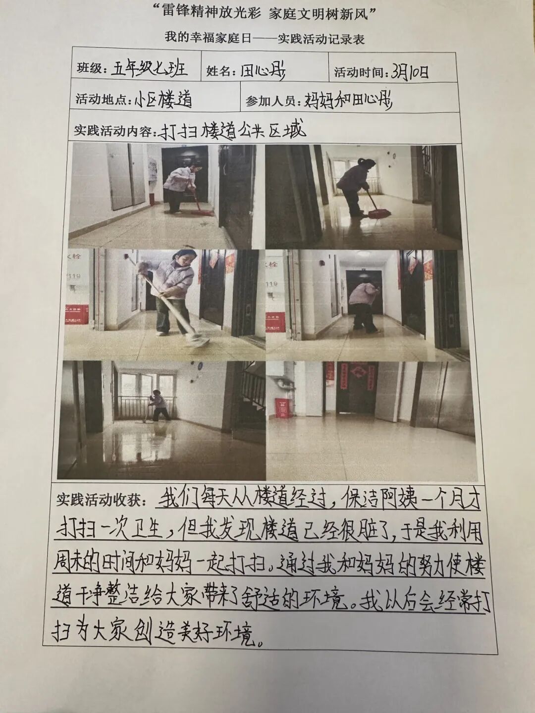 同学们利用周末时间,在家人的陪伴下,开展“雷锋精神放光彩 家庭文明树新风”家庭幸福日实践活动。