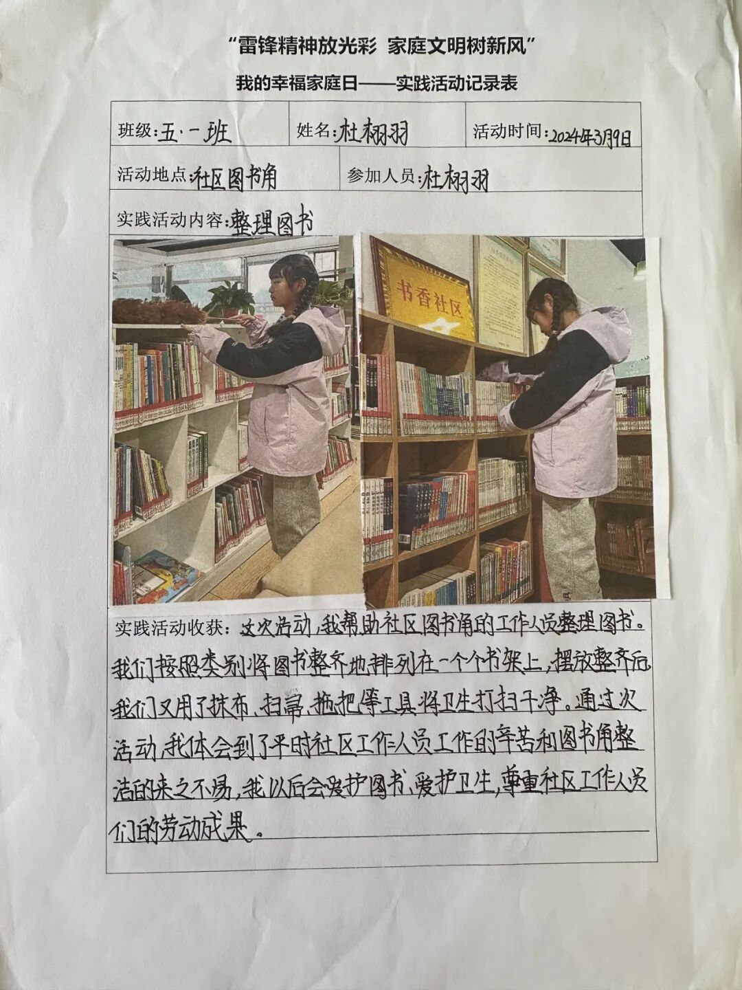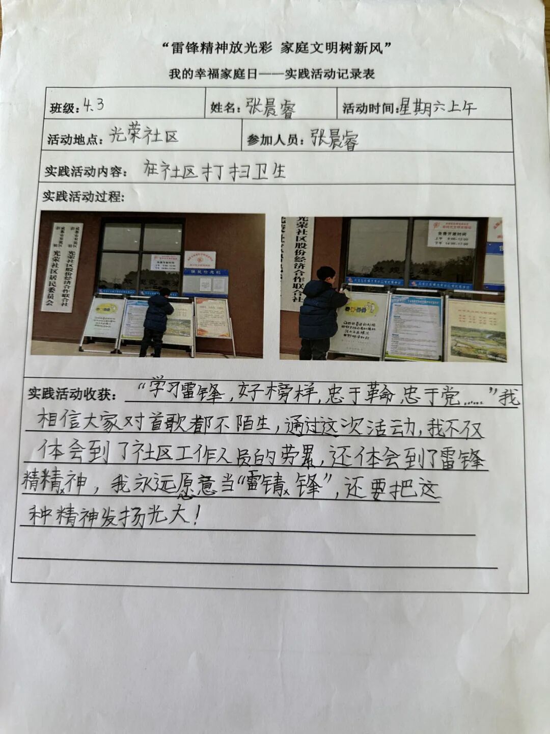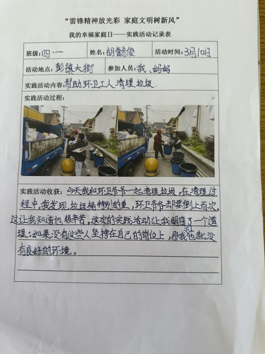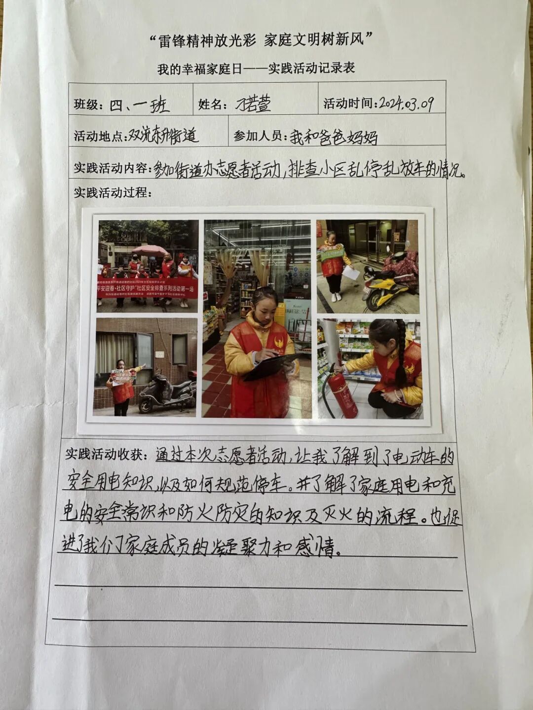 同学们利用周末时间,在家人的陪伴下,开展“雷锋精神放光彩 家庭文明树新风”家庭幸福日实践活动。
