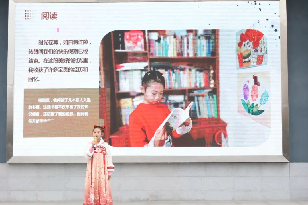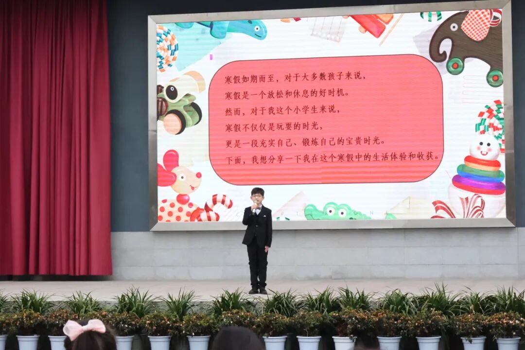 在周书瑶、杨思艺、陈恩睿、彭钰轩、范蠡、涂梓骞几位小主持热情洋溢的开场中,我们告别了丰富多彩又快乐有趣的寒假;在曾承皓、任芷乐、熊梓伊、张伊菡四位同学的假期生活故事分享中,我们学会在假期里学习、思考、收获和总结。