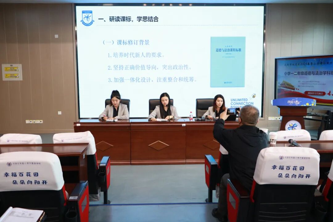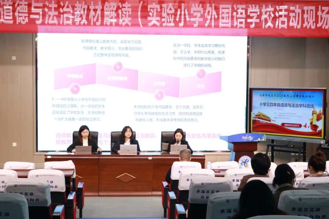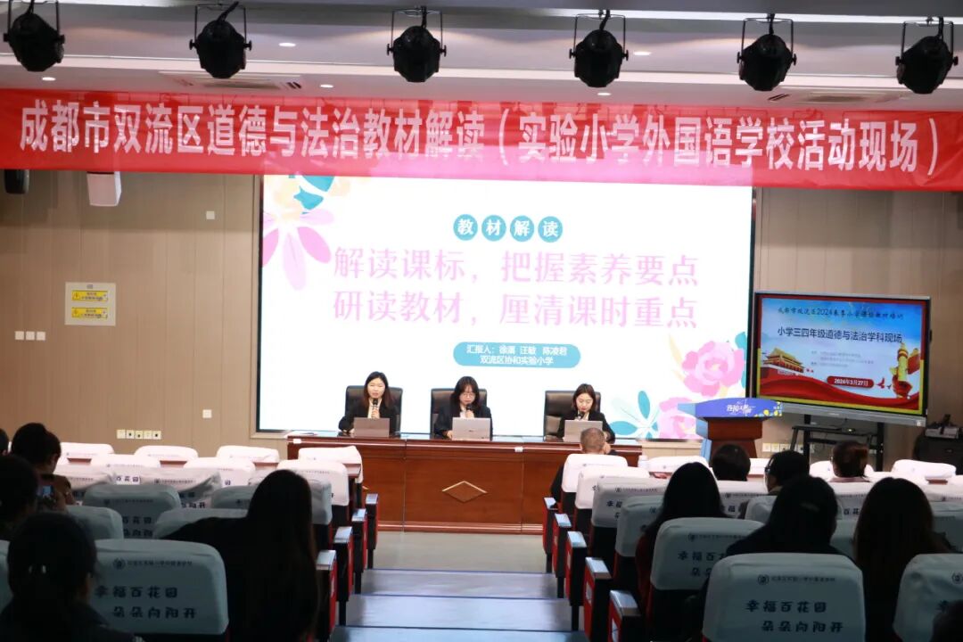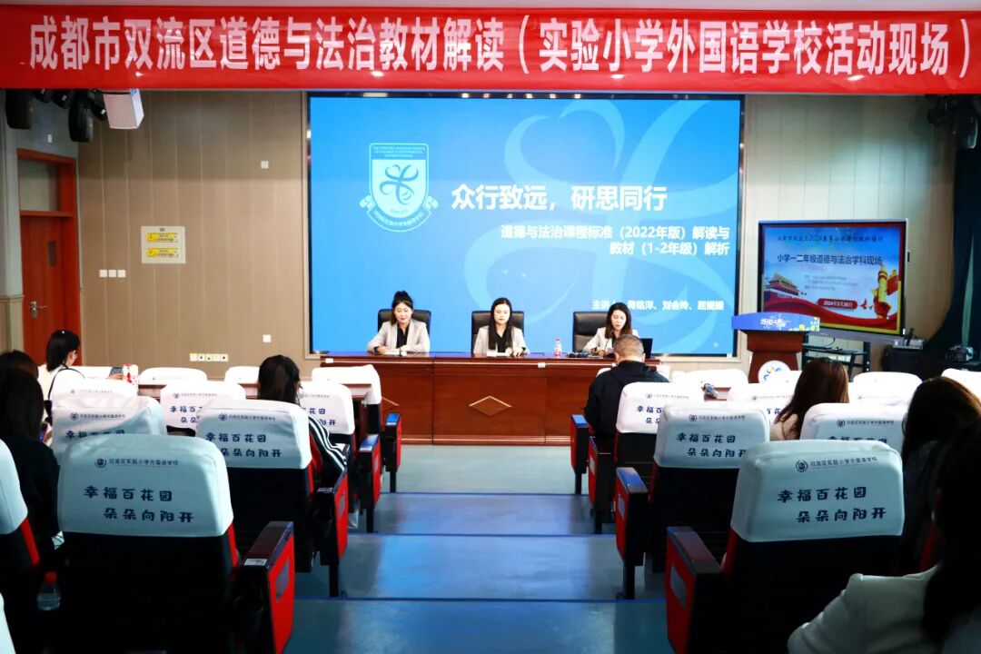 3月26日,双流区实验小学外国语学校的周铭洋、刘会玲、屈媛媛三位教师针对课标和一、二年级道德与法治教材进行解读与分析。三位教师以“众行致远,研思同行”为主题,围绕课标修订背景、课标主要变化以及教材内容进行阐释,充分体现了思想政治教育与时俱进的特点,也明确了核心素养导向的道德与法治课程的教学方向和教学要求。