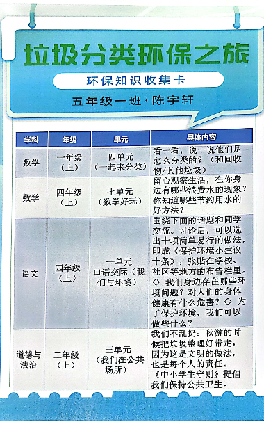 小朋友在所有科目教材中寻找涉及到环保的知识,把自己找到的知识,记录下来。