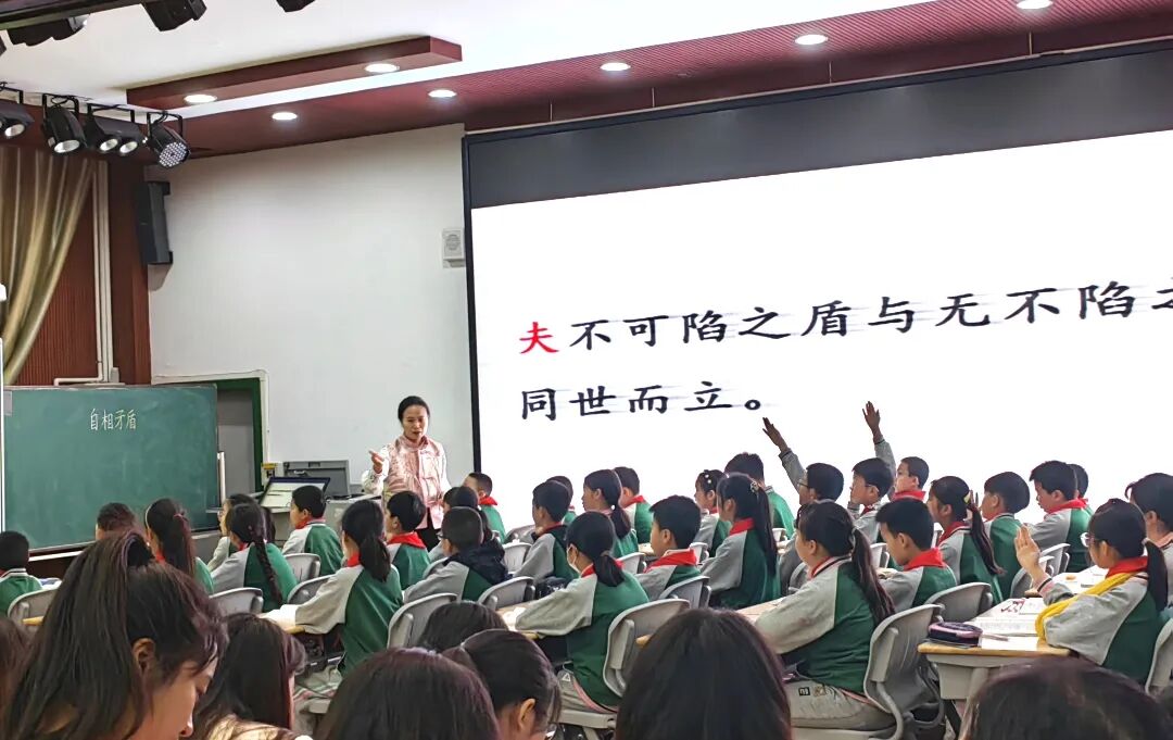 接着,双流区胜利小学资源室教师夏珊结合听障个案学生学科能力现状及当前最急切的教育需求——阅读理解能力提升,进行资源室课程展示。夏老师的资源室课程将学生要学习的文言文《自相矛盾》翻译成白话文,为学生集体课程学习奠定基础。夏老师给予学生学习支架,在熟读课文的基础上,借助要素串联法及学习伙伴的帮助,引导学生初步理解课文的主要内容。