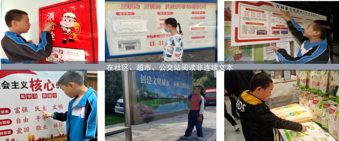 第一个“1”,以学校为单位,规划、开展每学期1个生活阅读主题活动。选择丰乐菜市场、欧尚超市、花园社区、双流图书馆等社区实践基地,引导家长带领学生阅读社区地图、标志、提示语、宣传单、告示通知等,进行真实社区阅读。