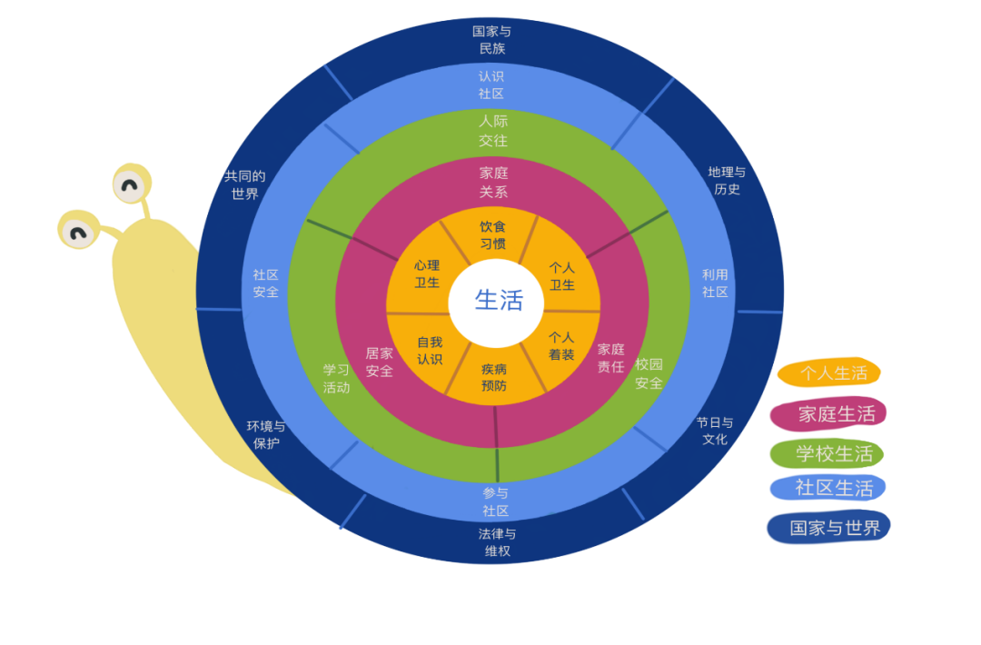 生活阅读内容结构为一心五环。一心,即从学生生活开启阅读;五环涵盖学生个人、家庭、学校、社区、国家与世界五类生活。