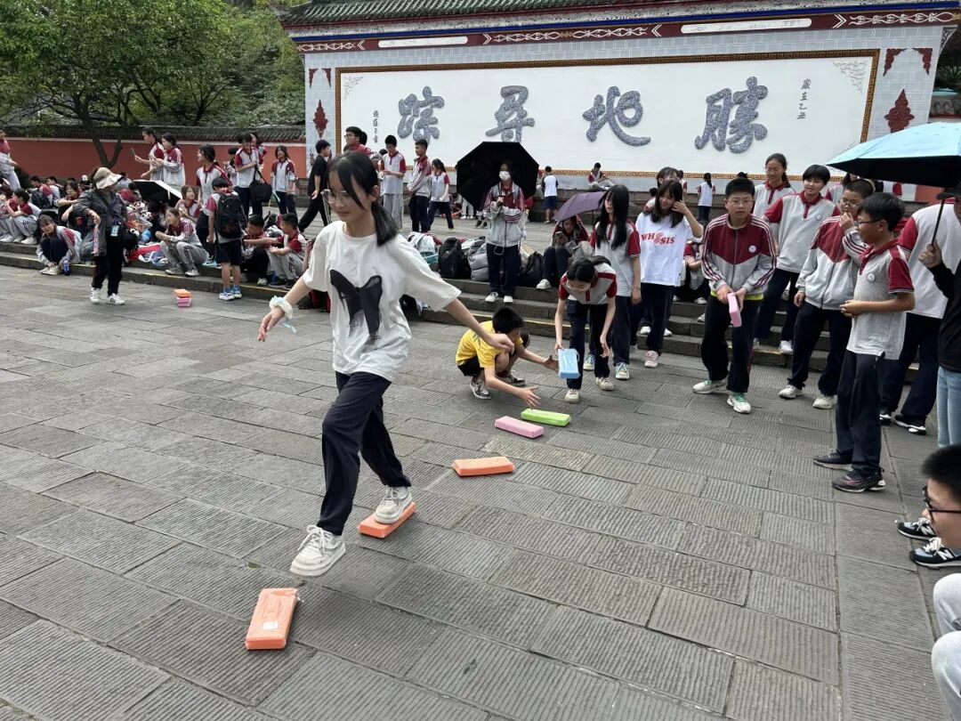 学生们登上伏龙观,聆听李冰父子为民降服恶龙的故事。