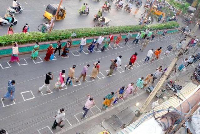 很多人只能外出购买食物。人们必须保持相互间的距离。