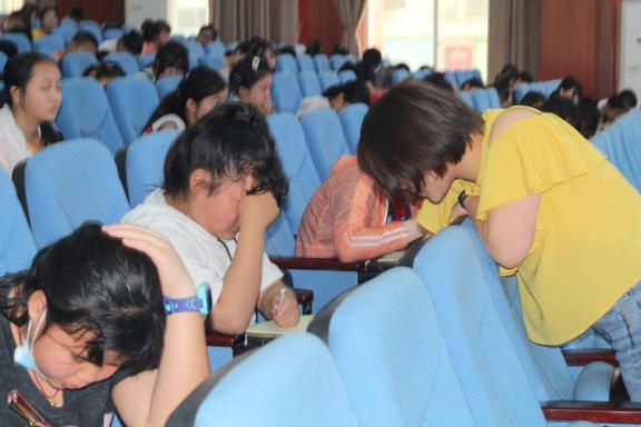 “写一写”环节,同学们在夏校长的引导下,闭上眼睛与自己对话。自己为接下来的考试制定目标,并对自己写下一段话。夏校长轻柔却又直击心灵的旁白,震撼着每一位孩子的内心,或许是对于即将分别的不舍,或许是出于内心的愧疚……无数学生潸然泪下,泪洒现场。